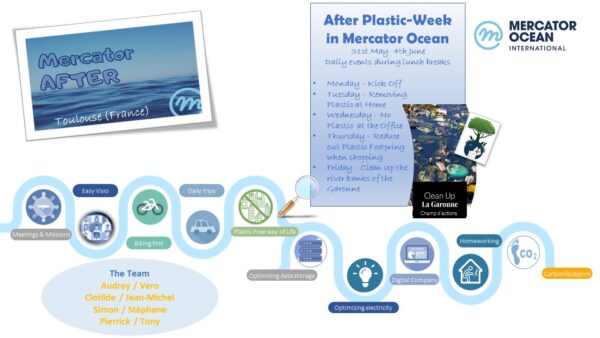 As a #EUGreenWeek partner, Mercator Ocean International‘s staff organises an internal “AFTER-Plastic week” within its premises, with activities that can be followed by co-workers also remotely. It will consist of several lunch break activities aiming at raising awareness on the impact of plastics on our ocean, as well as providing solutions to avoid plastics at work and in our everyday life. The week will be concluded by an outdoor event to clean a stretch of the riverbanks of the Garonne in collaboration with the association “Champ d’actions”