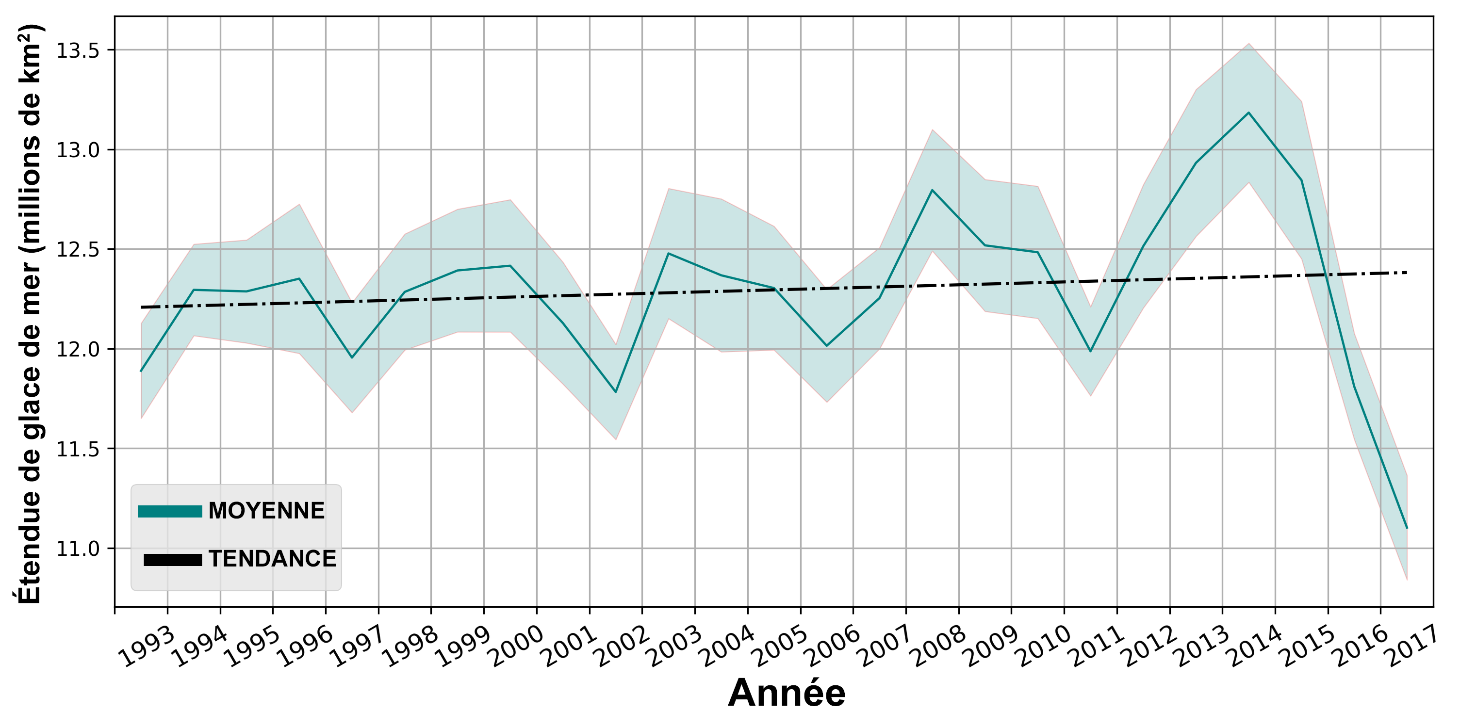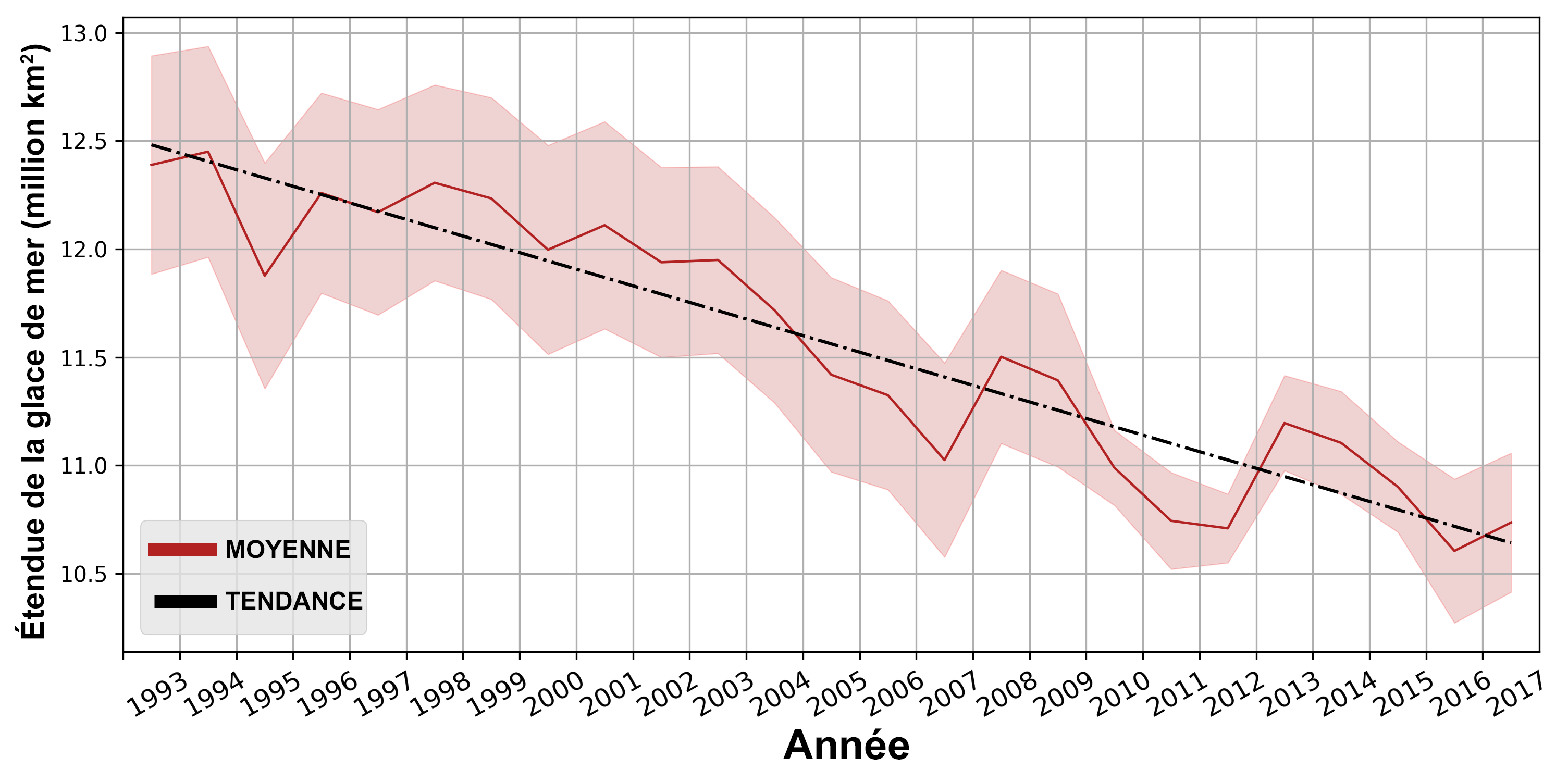 Figure Northern Hemisphere (Arctic): Annual mean sea ice extent (1993 to 2017) averaged over the northern hemisphere as expressed in kilometres squared (km2). Source: Copernicus Marine Ocean Monitoring Indicators, evaluated from ocean reanalyses. The red zone represents the standard deviation.
