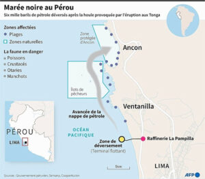 The incident occurred at the La Pampilla refinery, about 30 kilometers north of the Peruvian capital Lima in the Ventanilla district. On January 20, Peruvian president declared an environmental emergency for affected areas, home to some of the country’s most biodiverse ecosystems and to protected zones. The spill has affected many beaches and has left hundreds of fishers without work and threatens two protected marine reserves that provide refuge for diverse of sea life (see figure from AFP below).