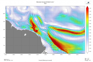 En base arrière, les routeurs reçoivent tous les jours trois cartes, celle du jour et la prévision à j+2, pour assurer le routage auprès des rameurs. L’exemple ci-dessous montre la circulation des courants en océan Atlantique, côté Guyane.