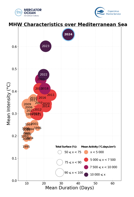 - In the Mediterranean Sea, 2024 broke previous records for all 4 characteristics (from 2023 in intensity, surface and activity and from 2011 in duration).