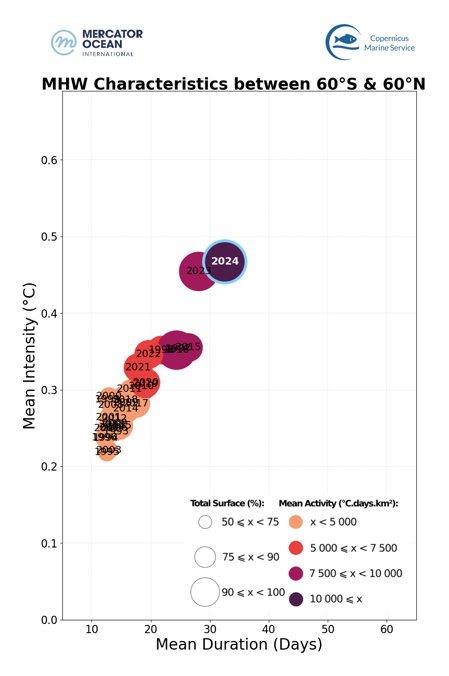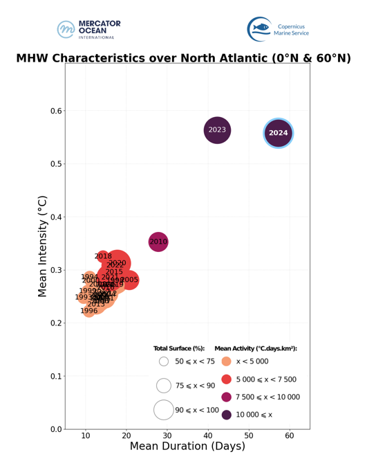 - 98.8% of the North Atlantic was affected by MHW during the year 2024. It is the second widest extent impacted by MHW after 2023 (99.6 %).