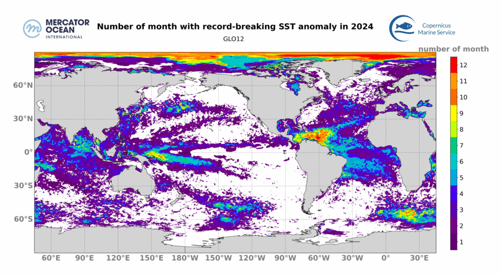 - Regions breaking record monthly means for more than 6 months in 2024 accounted for 6.3% of the global ocean; these include the Caribbean Sea, the Southern Ocean and in the western equatorial Pacific.