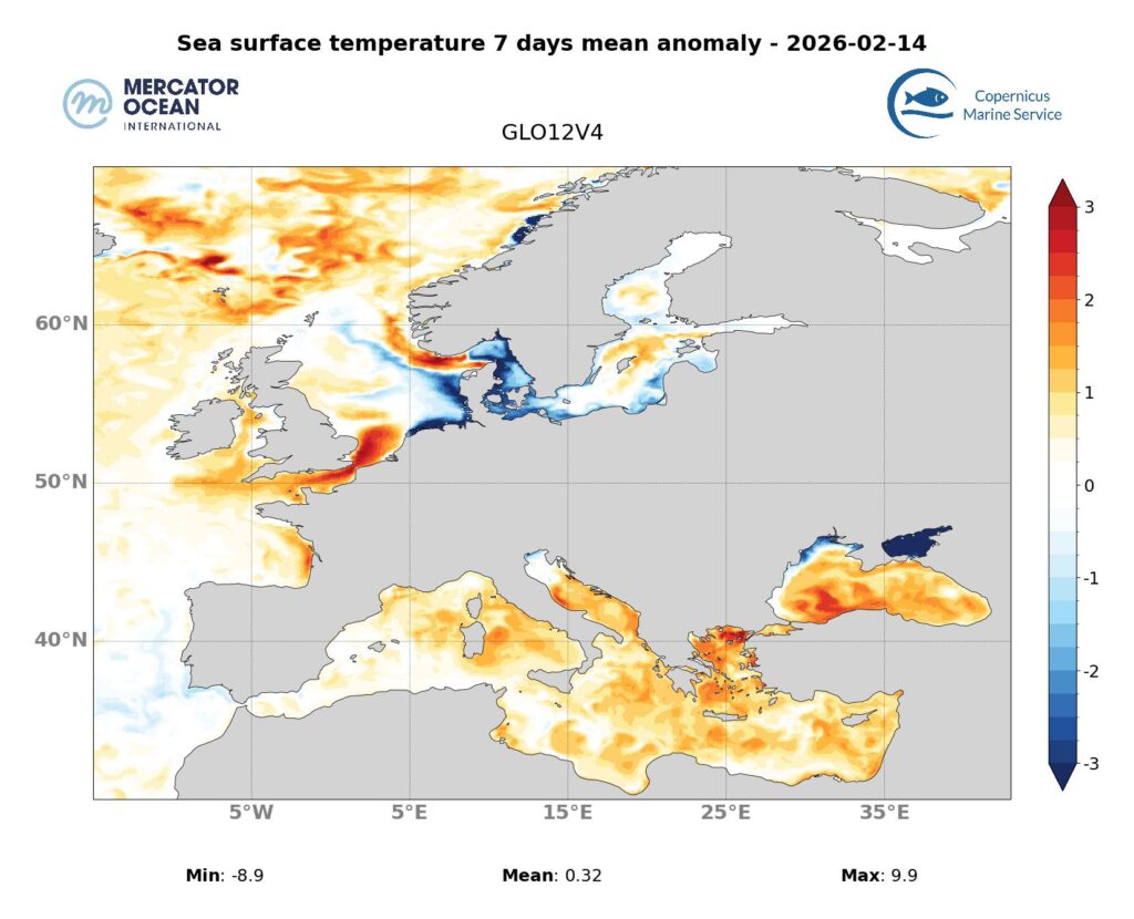 The extent and intensity of marine heatwaves along the northern European Atlantic coast are stable, ranging from moderate to locally strong.