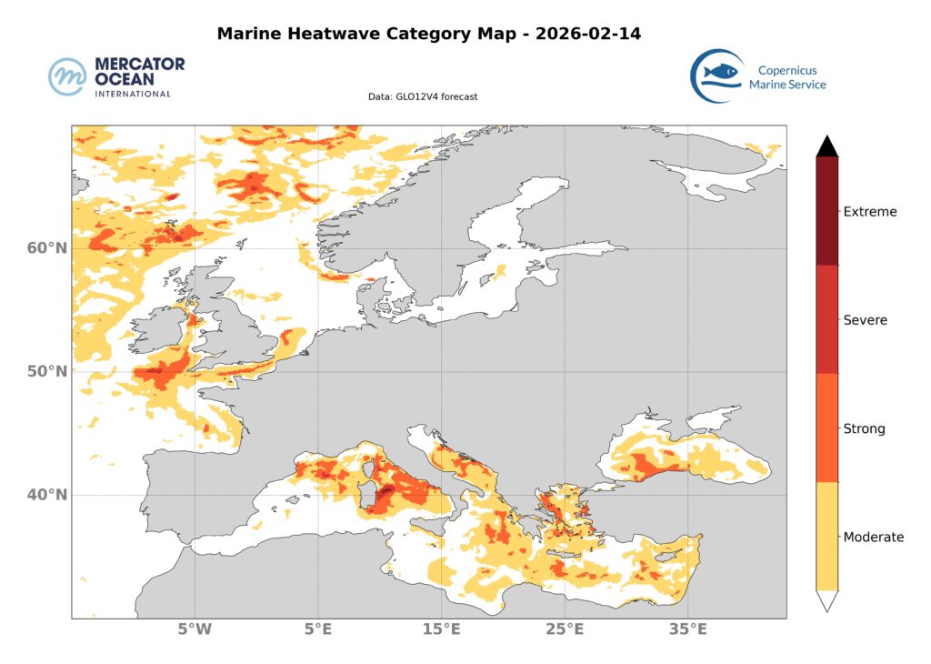 The extent of the marine heatwaves in both basins is stable. The marine heatwaves are intensifying between, in particular in the western basin where strong categories are developing.