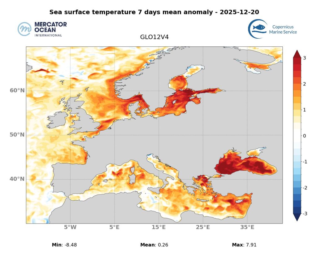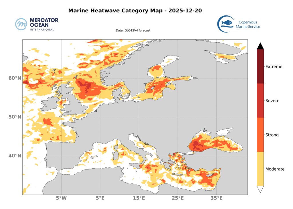 Marine heatwaves in the Bay of Biscay and between Iceland and the British Isles remain stable, with mostly moderate categories and locally strong categories. Marine heatwaves in the North Sea and Baltic Sea are intensifying, with the area covered by strong categories increasing.
