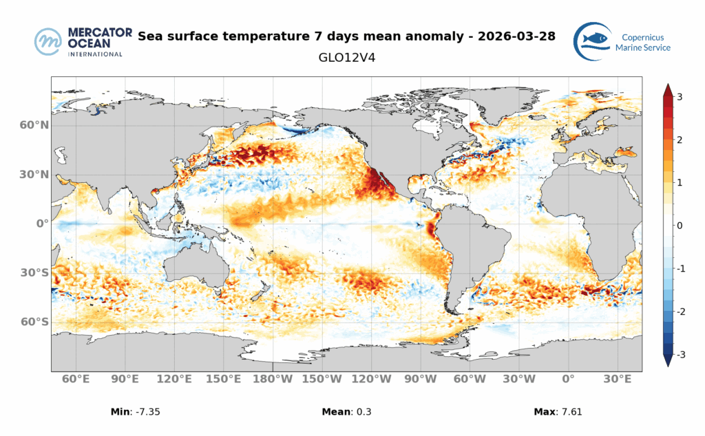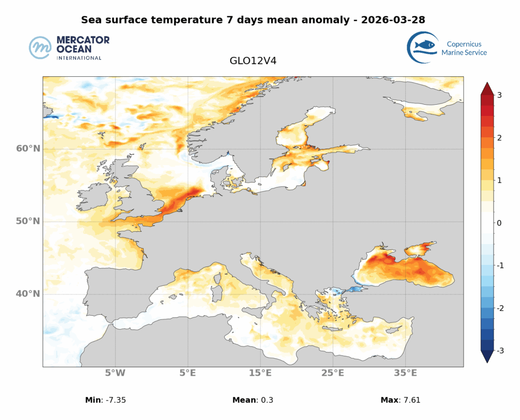 Average sea surface temperature anomalies in Europe region and in the global ocean for the week of the 22 to 28 March 2026.