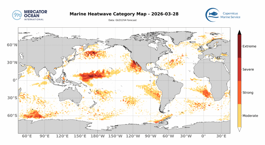 Marine heatwave categories forecast for 28 March, 2026. European zone. Credit: Mercator Ocean International