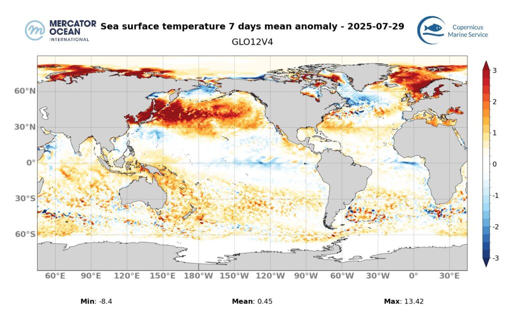 Mean sea surface temperature for the week 3 – 9 August 2025