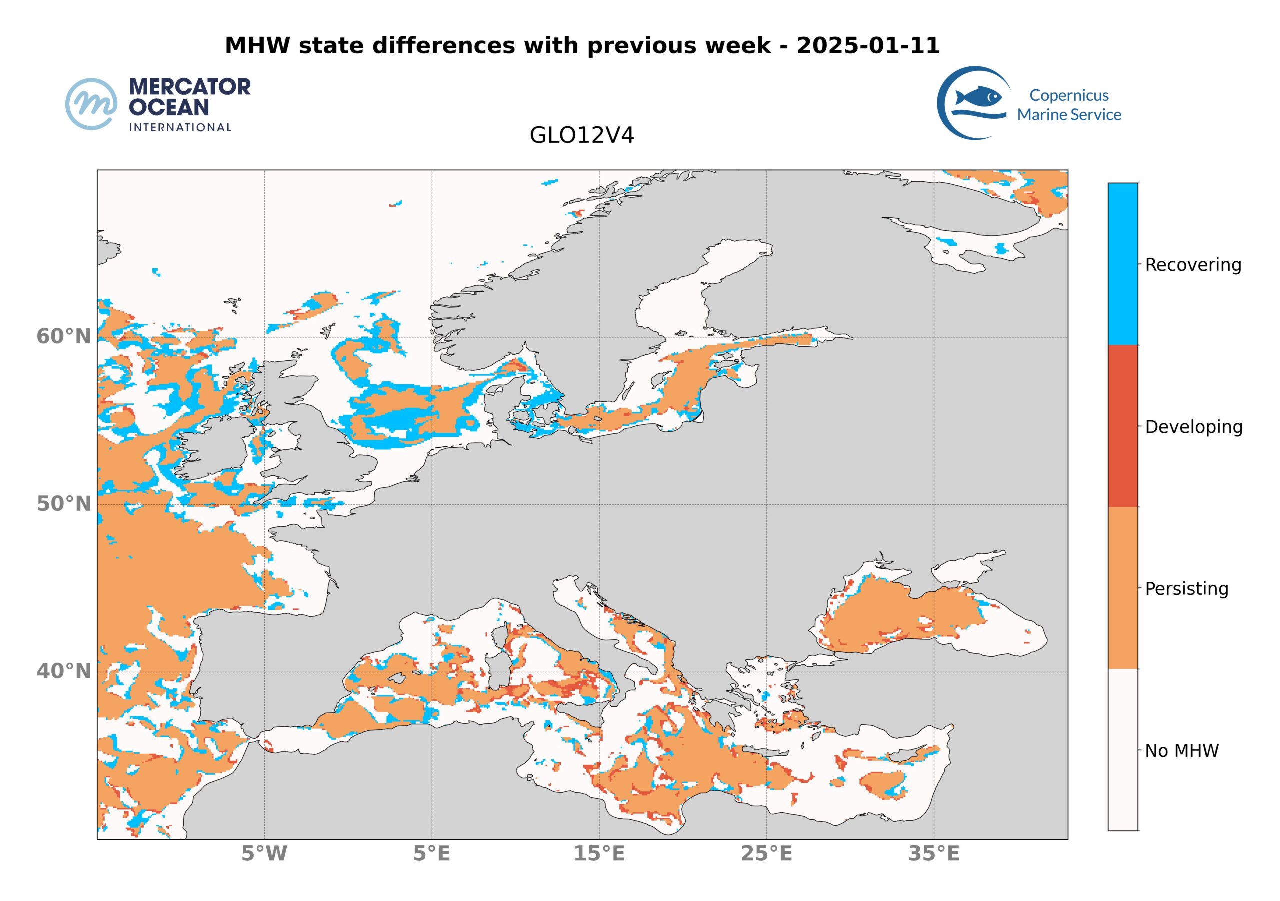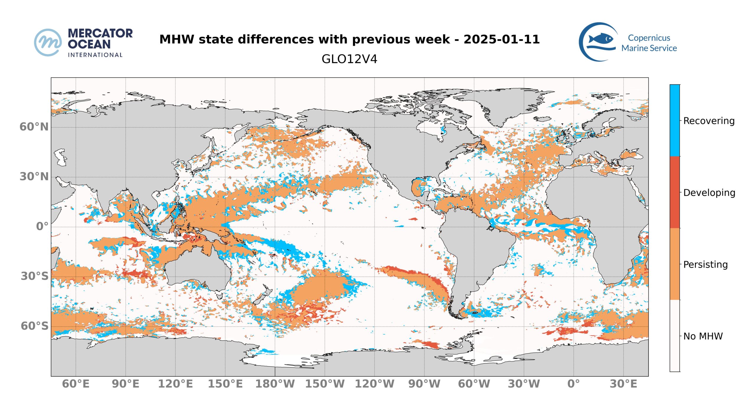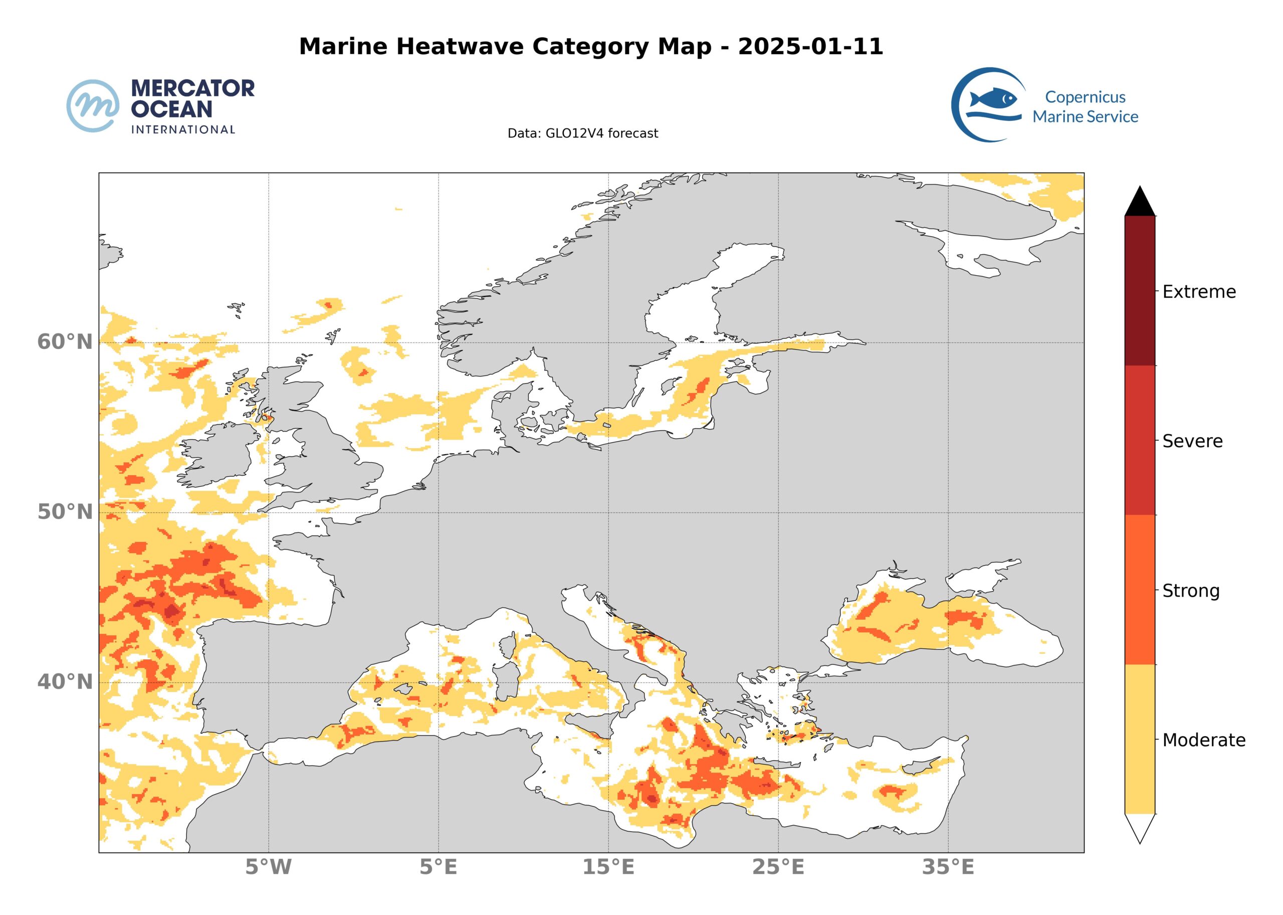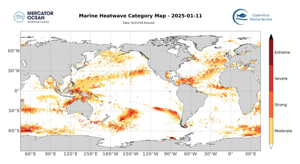 The marine heatwave bulletin provides forecasts and analysis of marine heatwave events across the globe and throughout the year. Used datasets include observations (satellite sea surface temperature maps) and numerical model analyses (assimilating satellite and in situ observations) to derive marine heatwave forecasts for a 10-day period. This week’s forecasts were produced using as a comparison the marine heatwave situation on 31/12/2024.