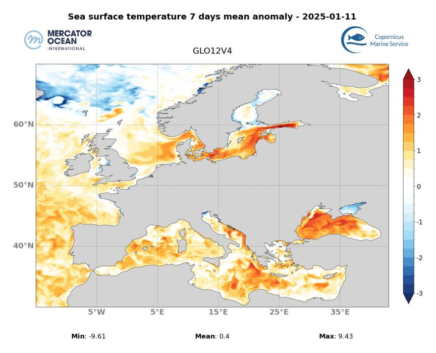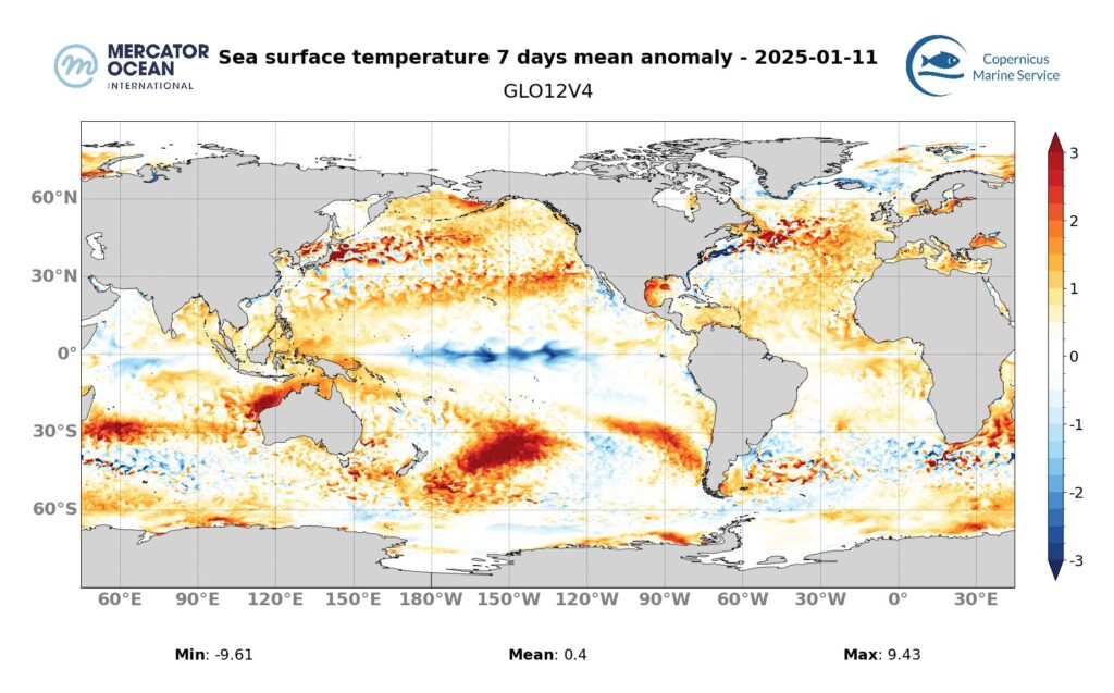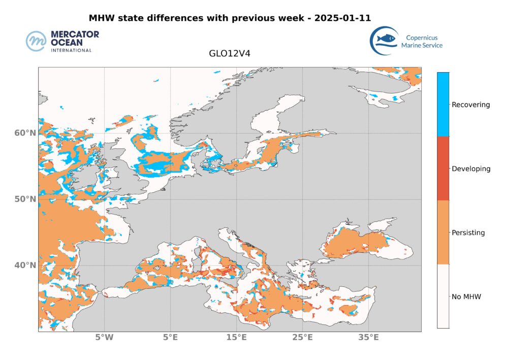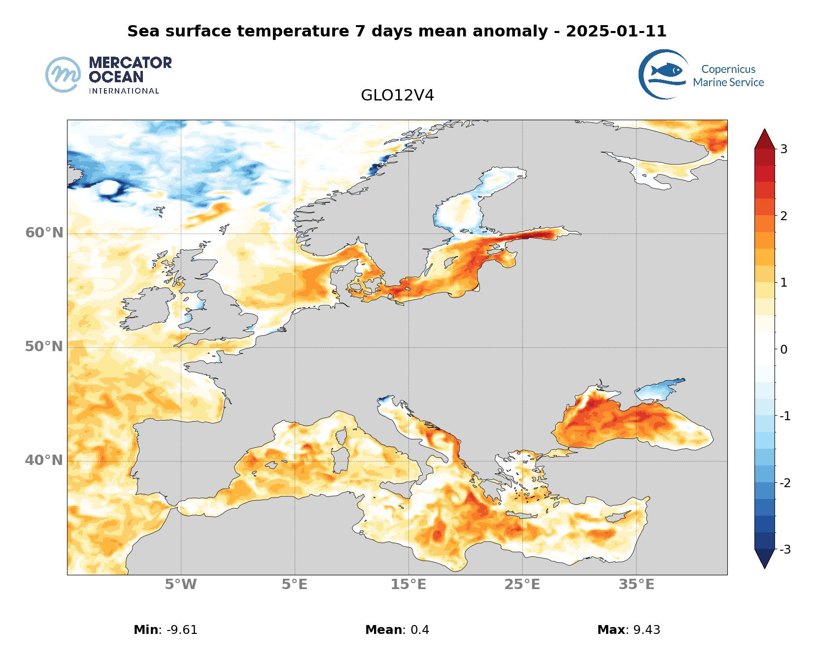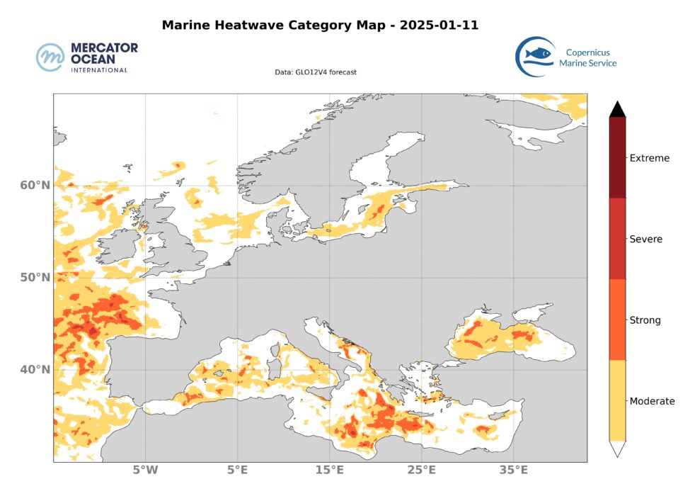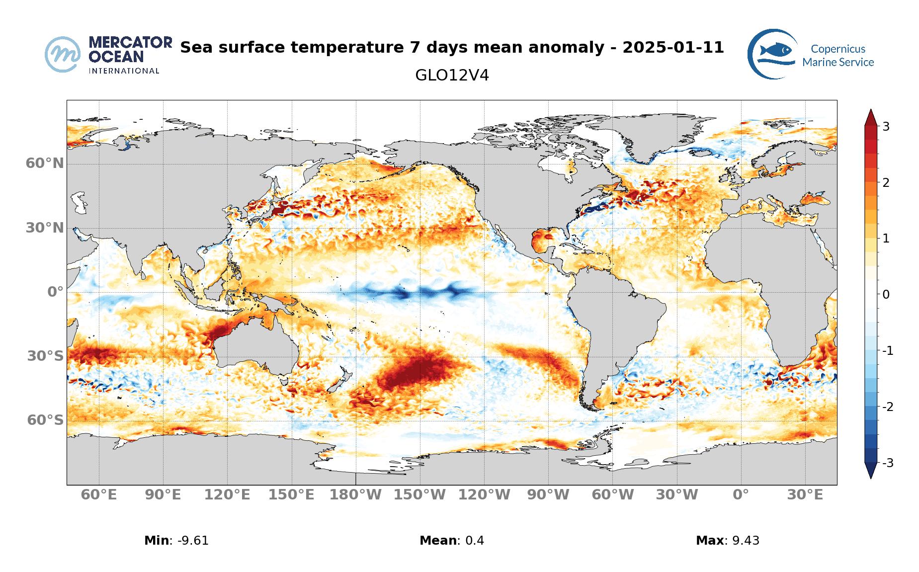 The marine heatwave bulletin provides forecasts and analysis of marine heatwave events across the globe and throughout the year. Used datasets include observations (satellite sea surface temperature maps) and numerical model analyses (assimilating satellite and in situ observations) to derive marine heatwave forecasts for a 10-day period. This week’s forecasts were produced using as a comparison the marine heatwave situation on 31/12/2024.