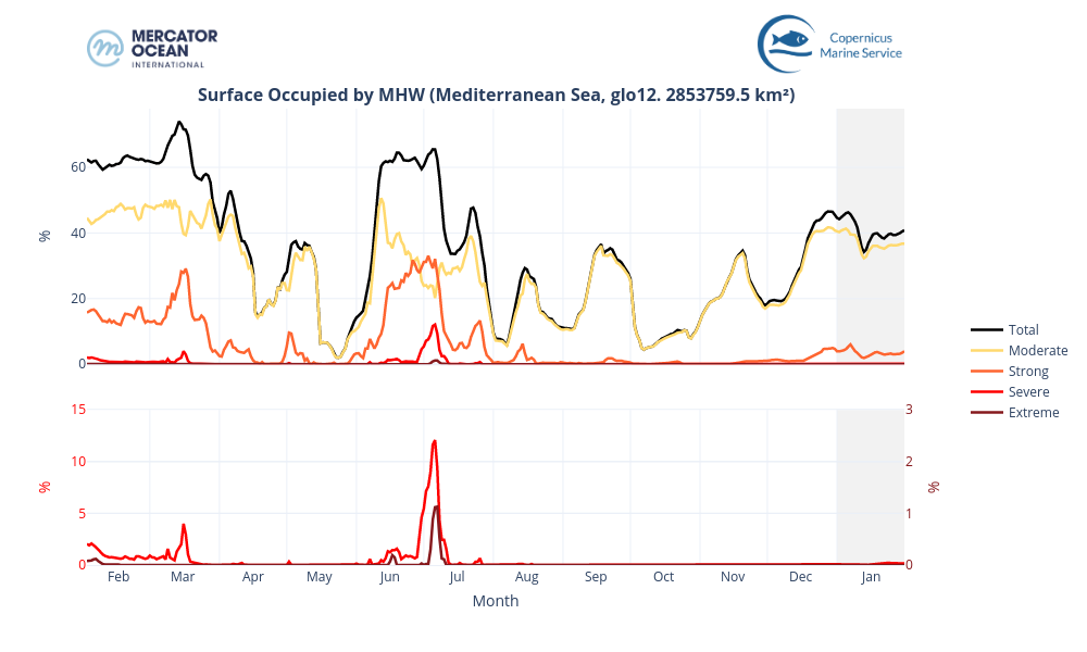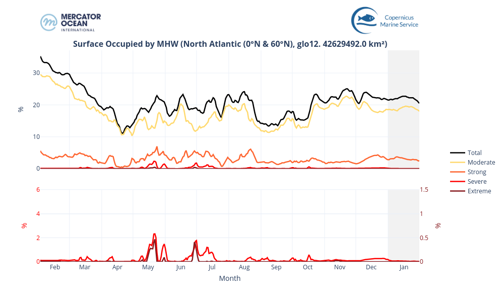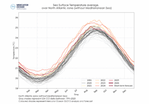 Mercator Ocean International publishes a monthly sea surface temperature bulletin reporting on mean temperature and marine heatwave conditions for the month just passed. It includes: