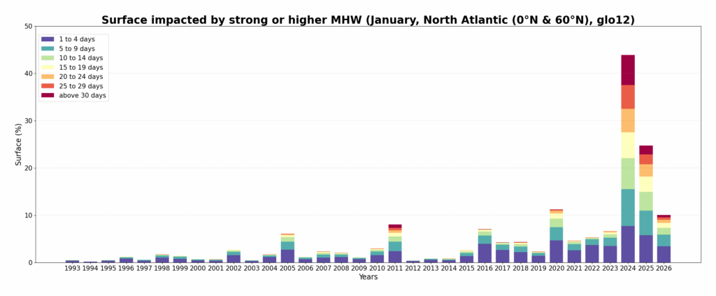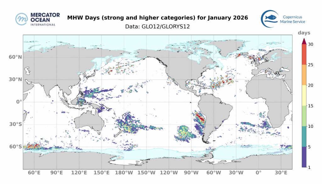 January 2026 mean SSTs are above average for 69% of the global ocean (between 60°S and 60°N), with 12% exceeding the average by at least 1°C.