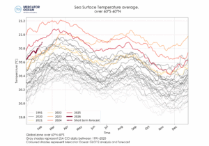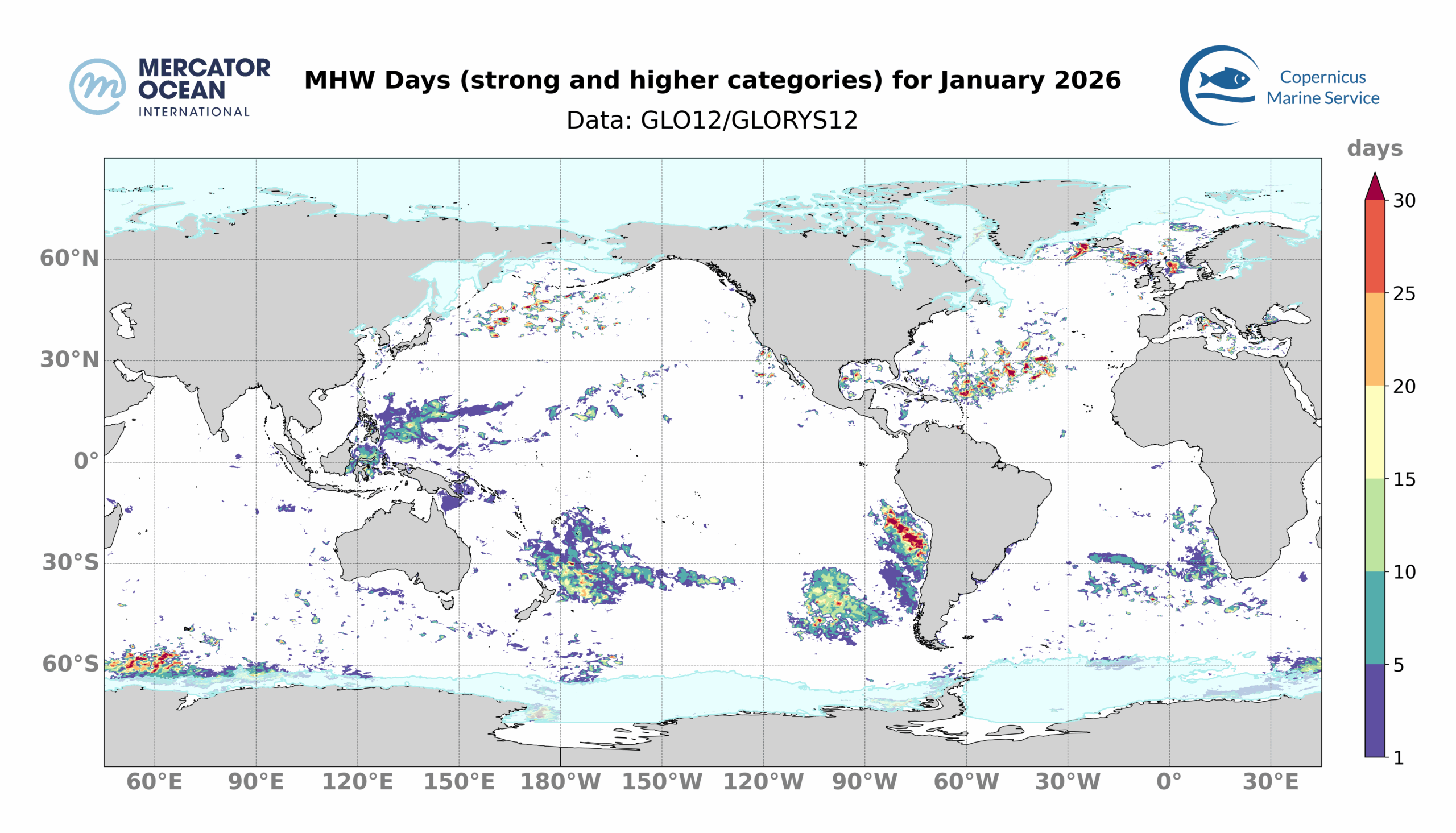 Mercator Ocean International publishes a monthly sea surface temperature bulletin reporting on mean temperature and marine heatwave conditions for the month just passed. It includes: