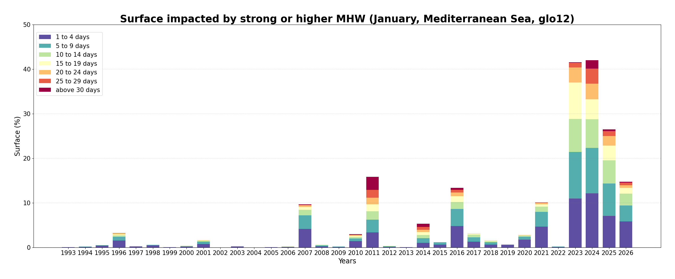 Notes: The global analysis system was used to study MHWs for 2024 and 2025. To study MHWs for previous March (1993 to 2023), it was used the reanalysis system. The reanalysis product was used for generating a daily climatology using the 30-year period from 1993 to 2022