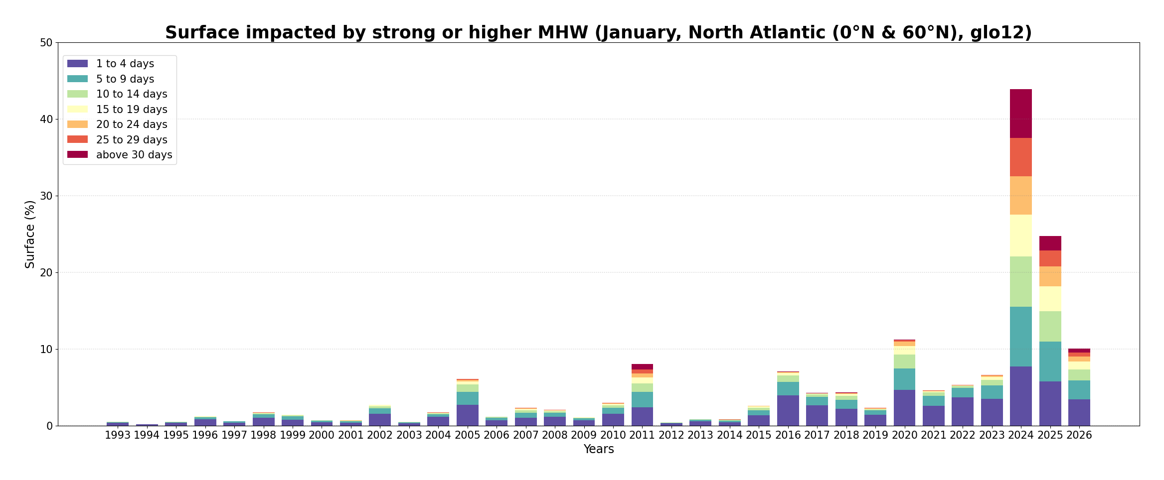 MHW Characteristics for January months from 1993 to 2026. Duration, intensity, extent and activity averaged for each January month between 1993 and 2026 for the global ocean (left), for the Mediterranean Sea (center) and the North Atlantic Ocean (right). January 2026 is highlighted with a blue edge.