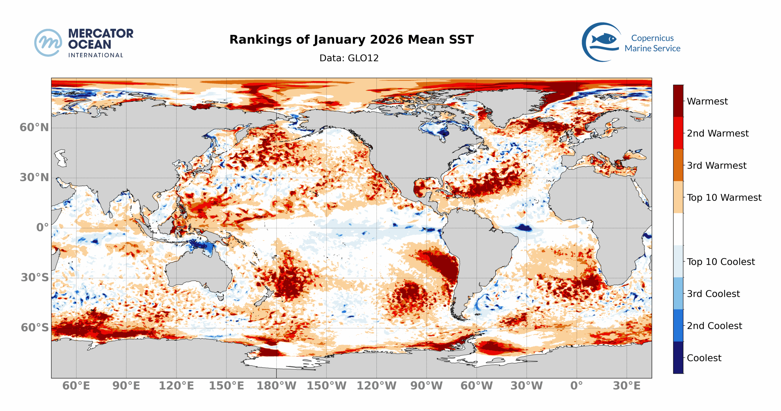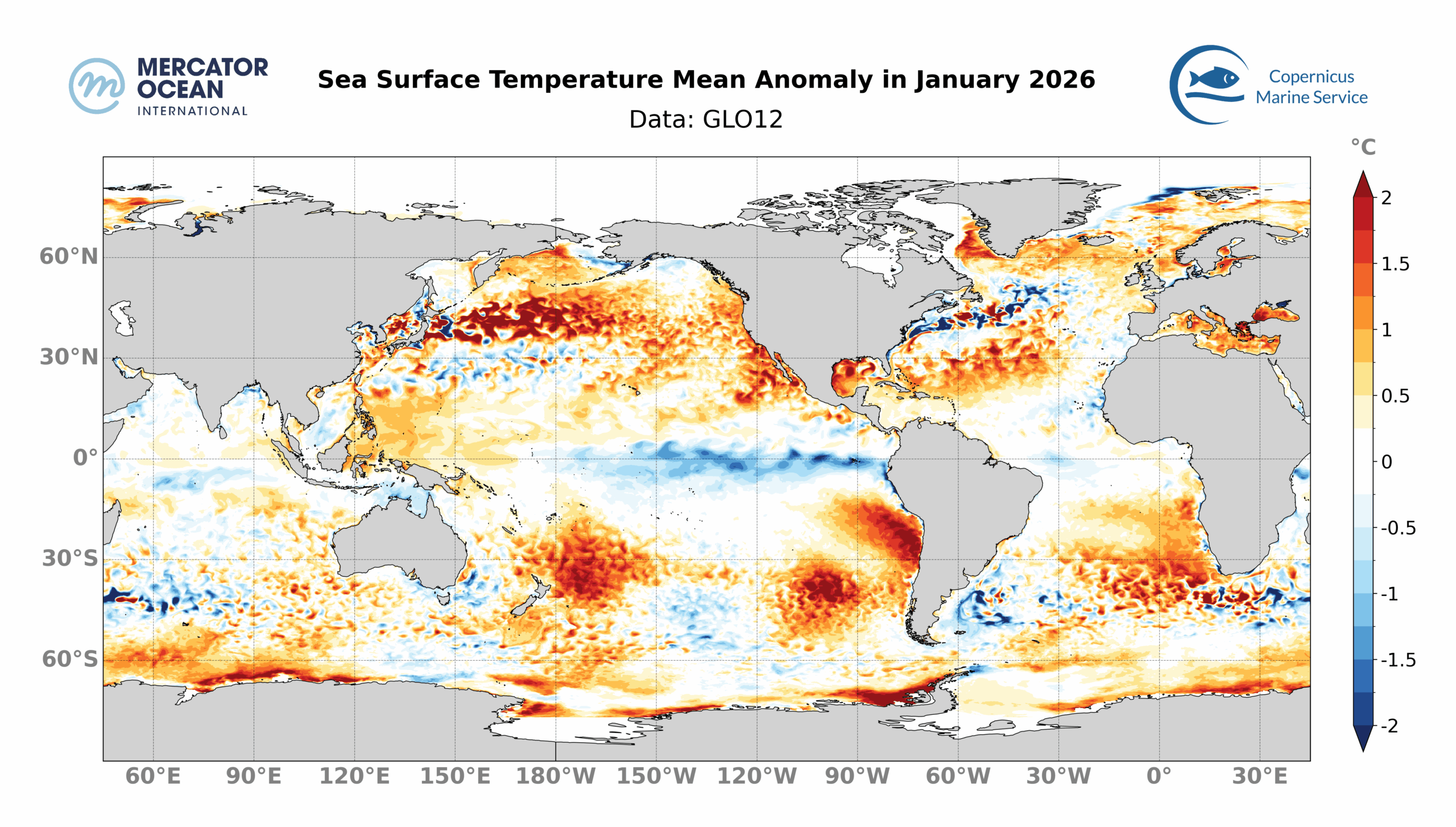 January 2026 mean SSTs are above average for 69% of the global ocean (between 60°S and 60°N), with 12% exceeding the average by at least 1°C.