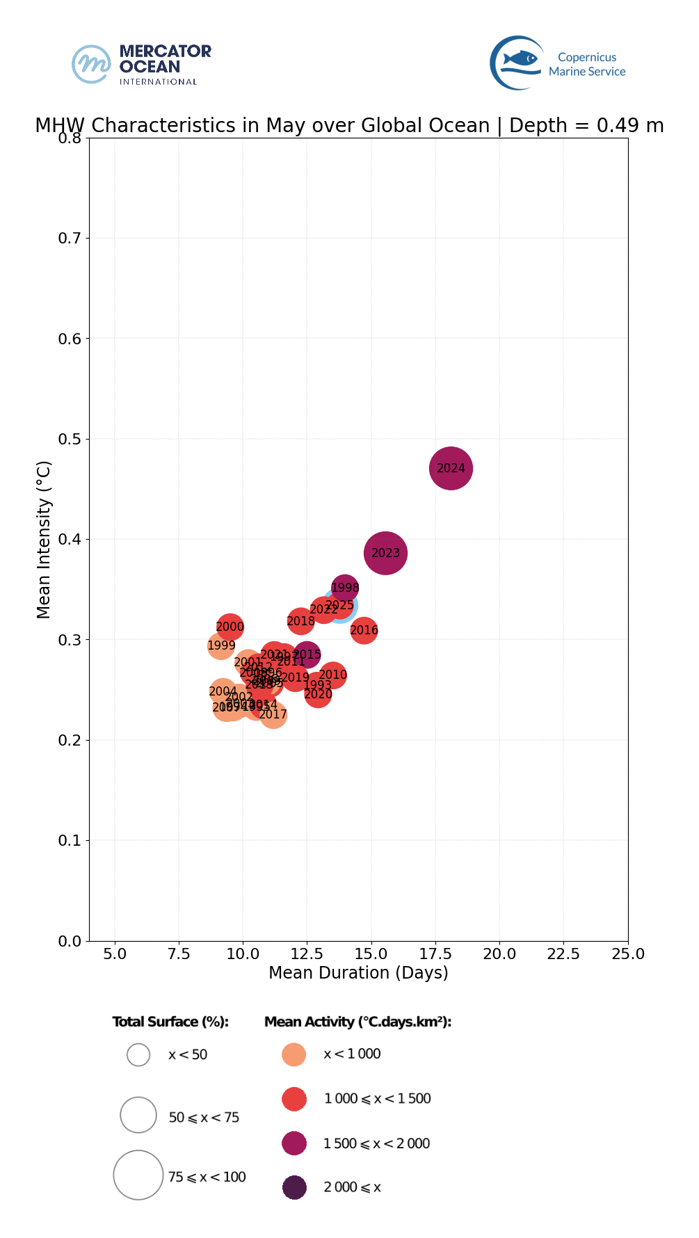 - On a global scale, May 2025 is the 4th most extreme May month in terms of MHW (after 1998, 2023 and 2024) with characteristics similar to May 2022.