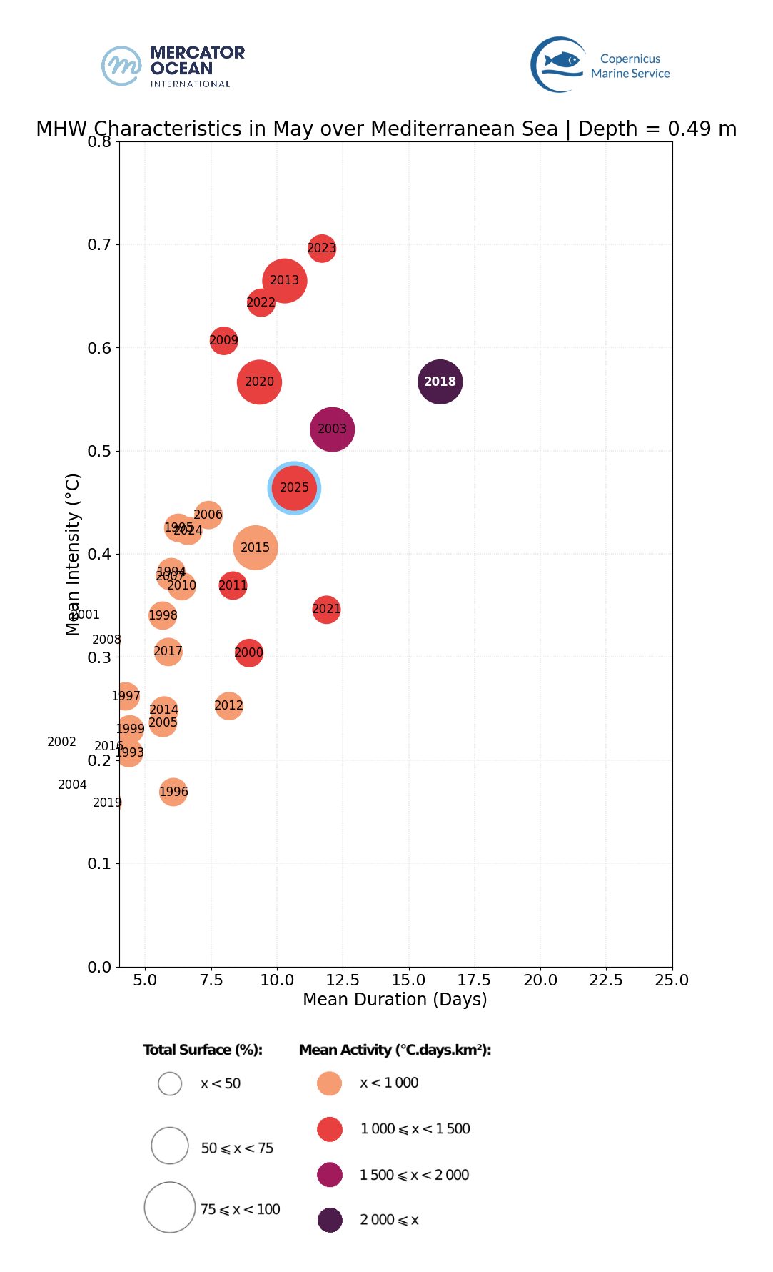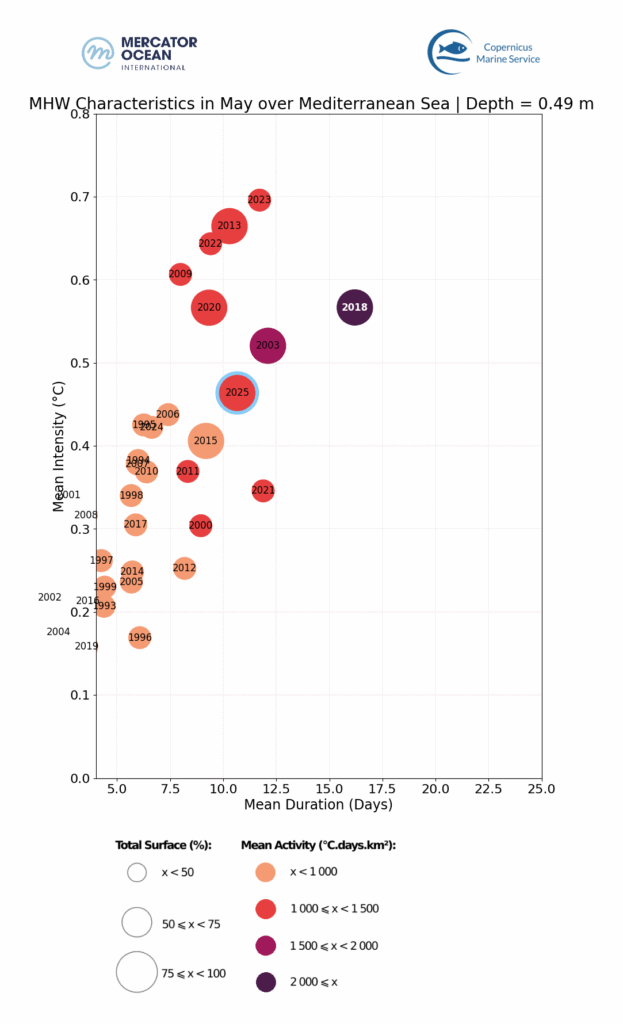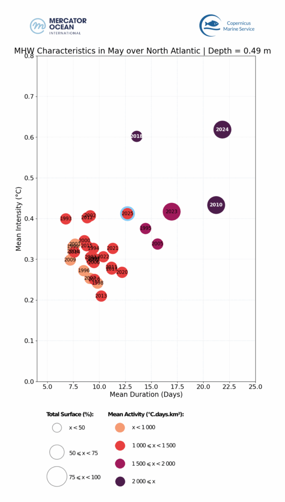 The MHW statistics (duration, intensity, surface occupied and activity) for May 2025 are compared to those for May months from previous years since 1993.