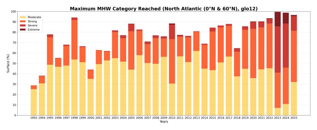 • 97% of the North Atlantic (between 0°N and 60°N) was affected by MHW in 2025. It is the third largest extent impacted by MHW after 2024 (99%) and 2023 (99.6%).