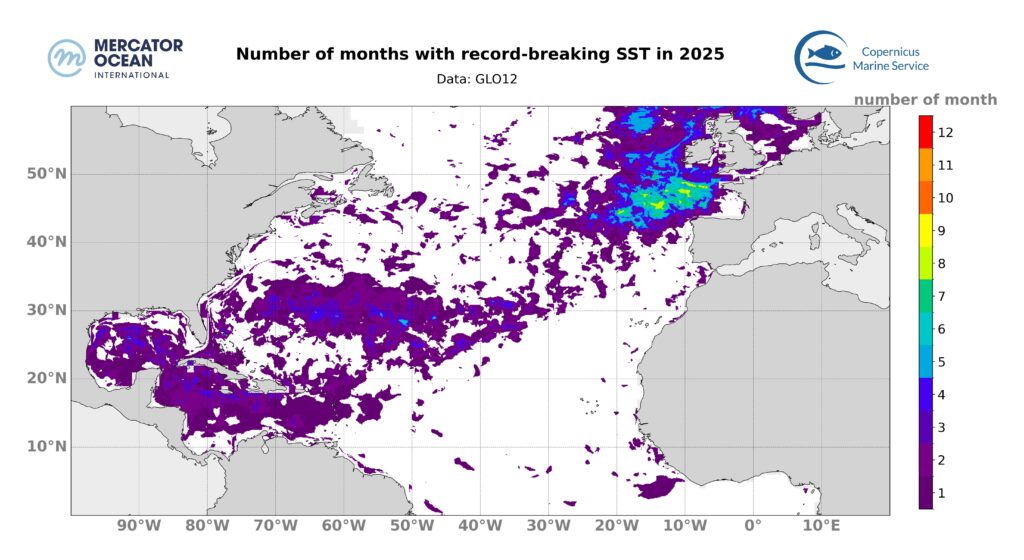 • 37% of the North Atlantic (between 0°N and 60°N) experienced at least one month of record-breaking SST during the year 2025. The eastern North Atlantic, towards the European coast, shows a widespread region with 4 to 5 months of record monthly mean SST, reaching locally up to 8 months.