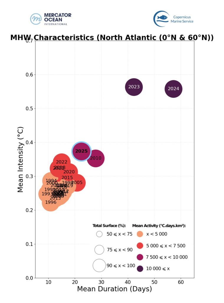 • In 2025, the North Atlantic was the third most extreme in terms of MHWs intensity (after 2024 and 2023) and the fourth in terms of MHW duration (after 2010, 2023 and 2024).