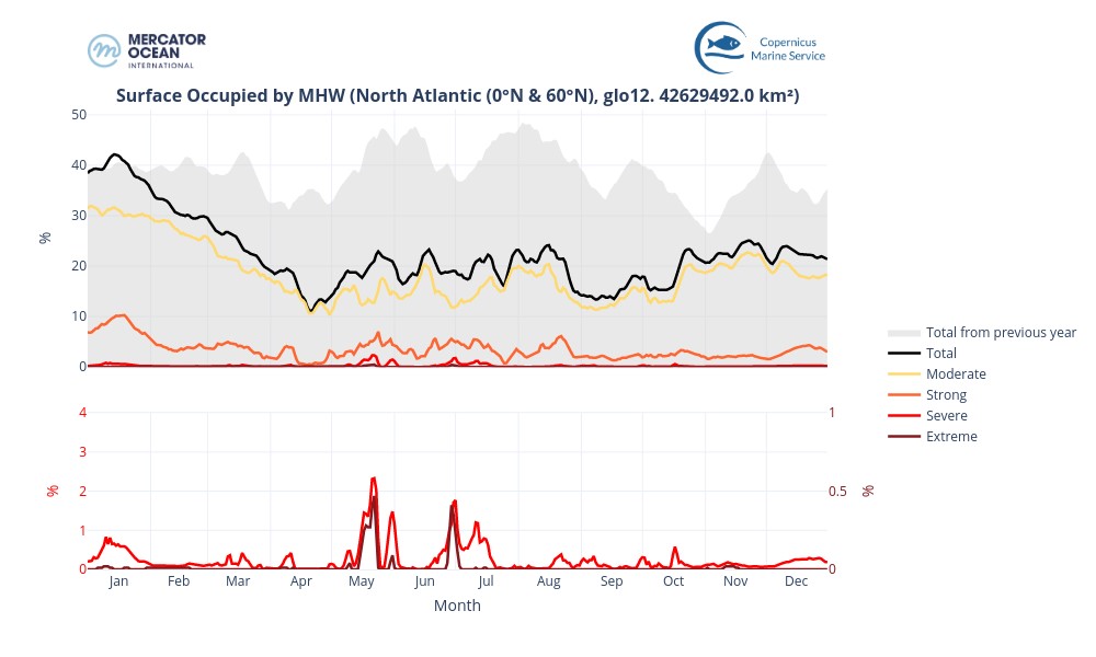 MHW can be classified based on their intensity into 4 categories (moderate, strong, severe, or extreme). We monitor daily the surface occupied by MHWs and show for the entire year the proportion of the North Atlantic (between 0°N and 60°N) exposed to MHWs. The results from 2025 are represented in solid lines. For comparison with the previous year, results from 2024 are represented in grey shaded area.