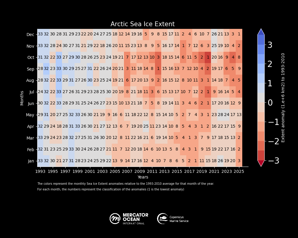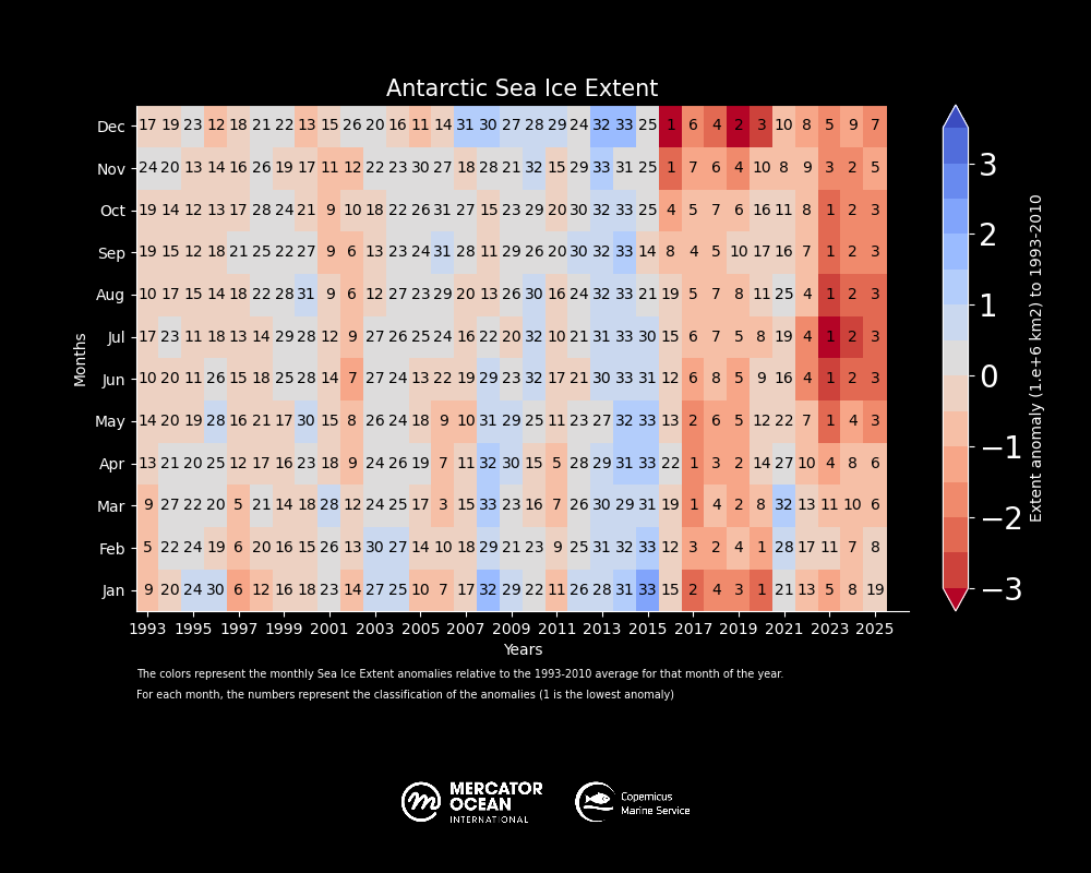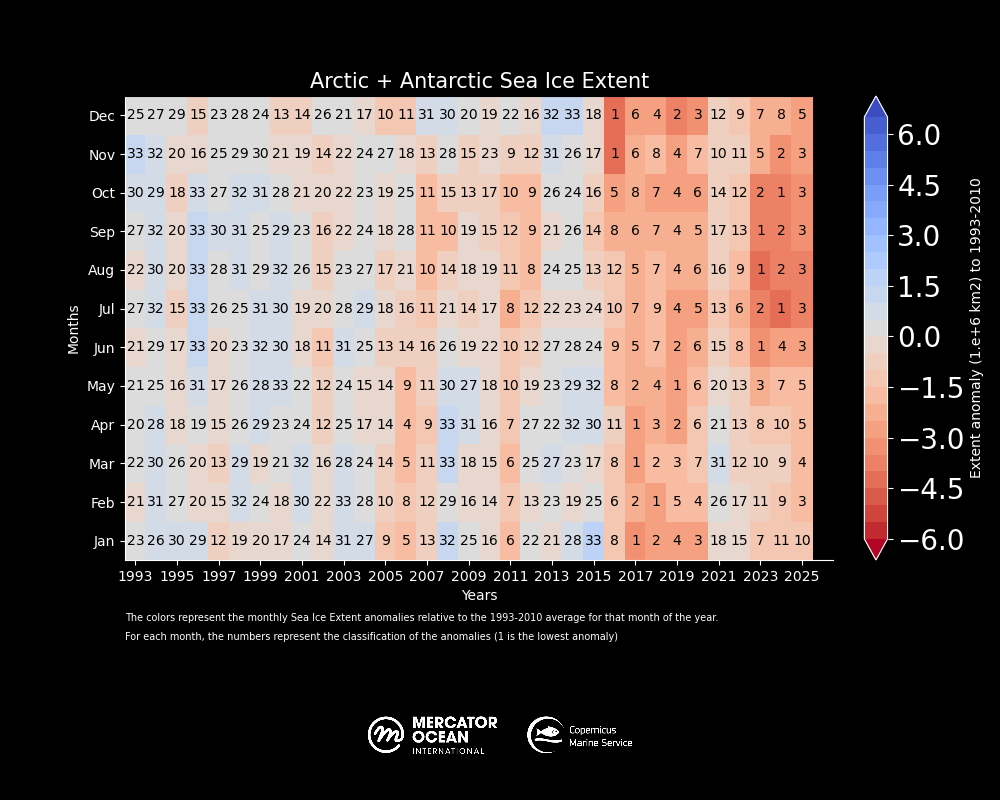 Global sea ice cover in 2025 continued well below the long-term average for most of the year. 11 out of 12 months of the year within the five lowest extents.