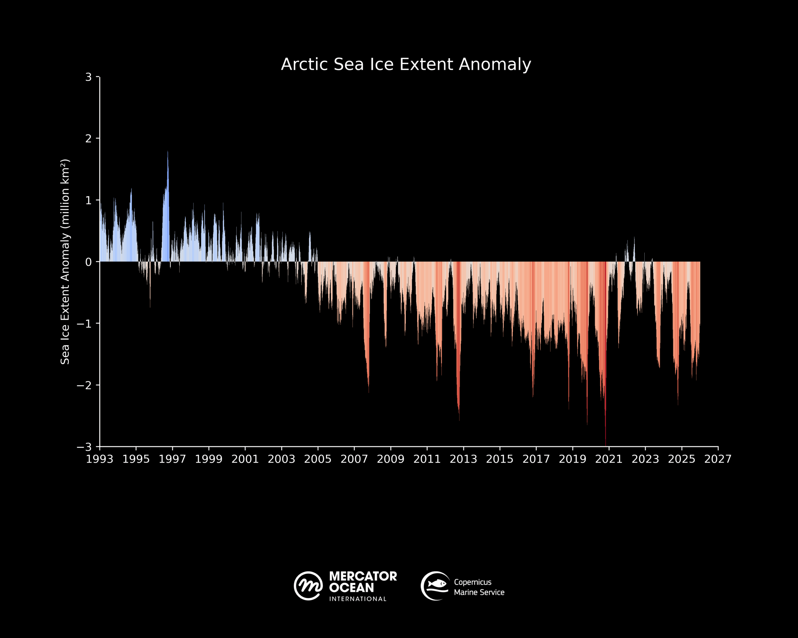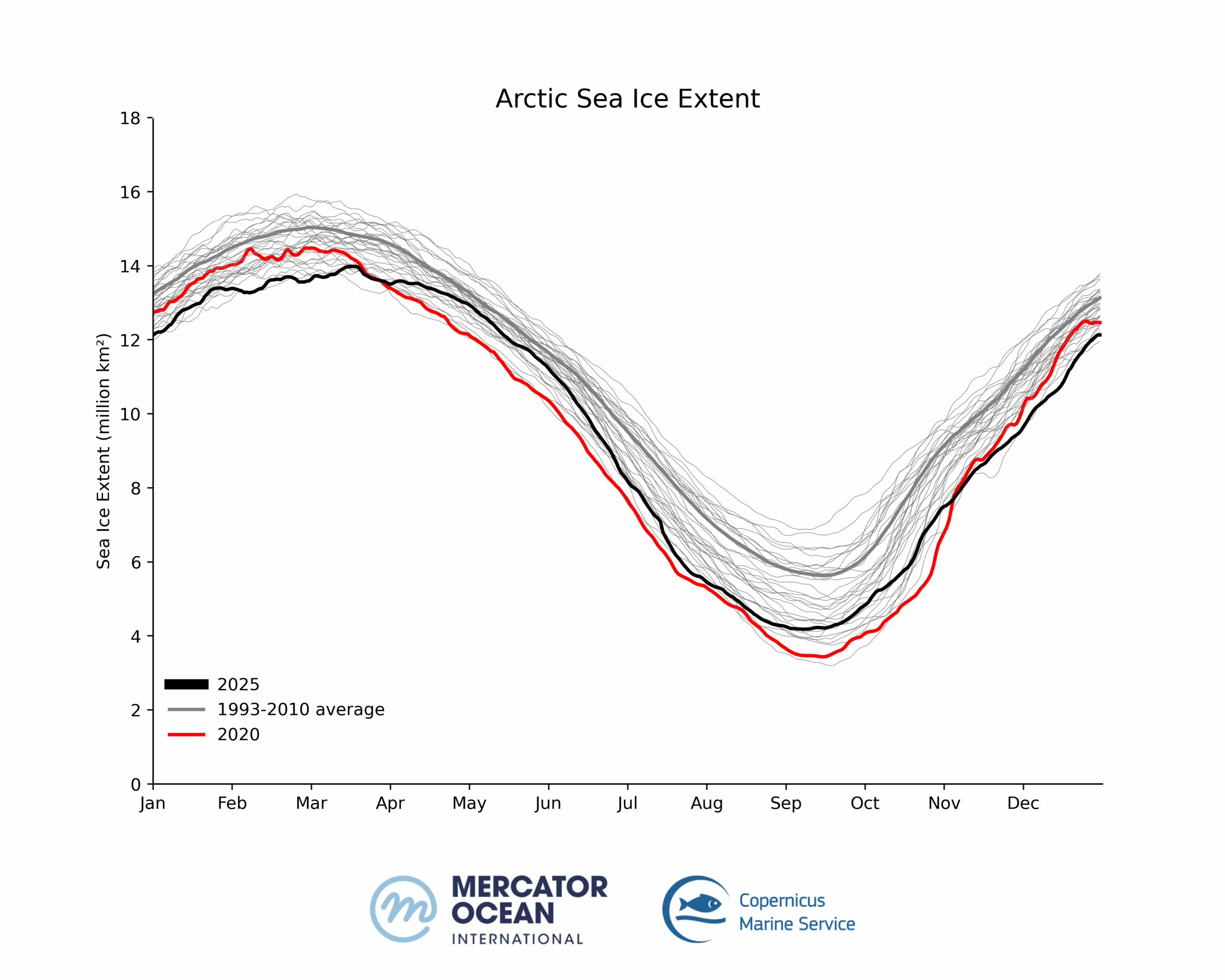 Entering November 2025, the formation of sea ice remained very low for the season below the long-term average of 1993-2010) and as the second lowest for this month after 2016. December 2025 reached record low sea ice values in the region.
