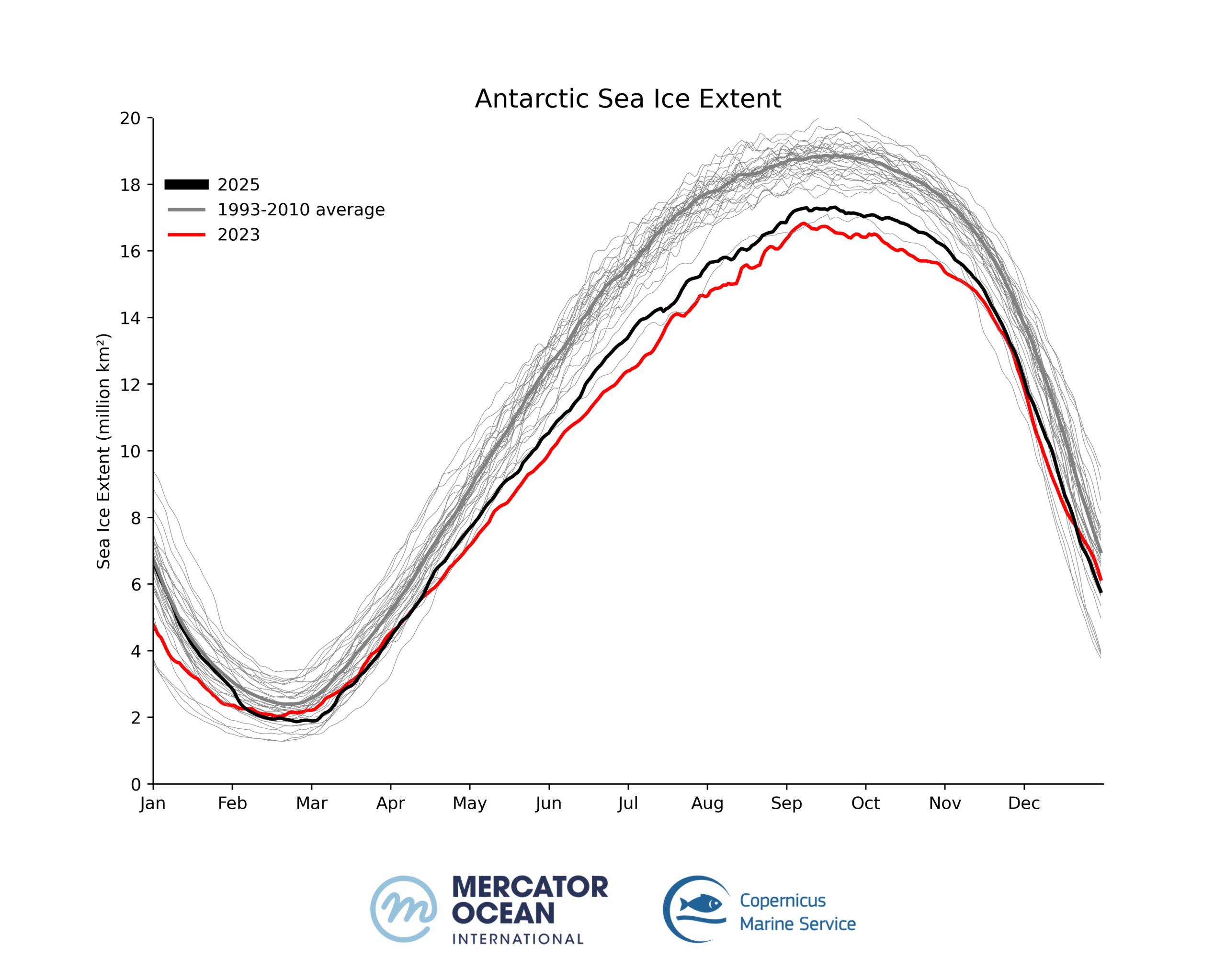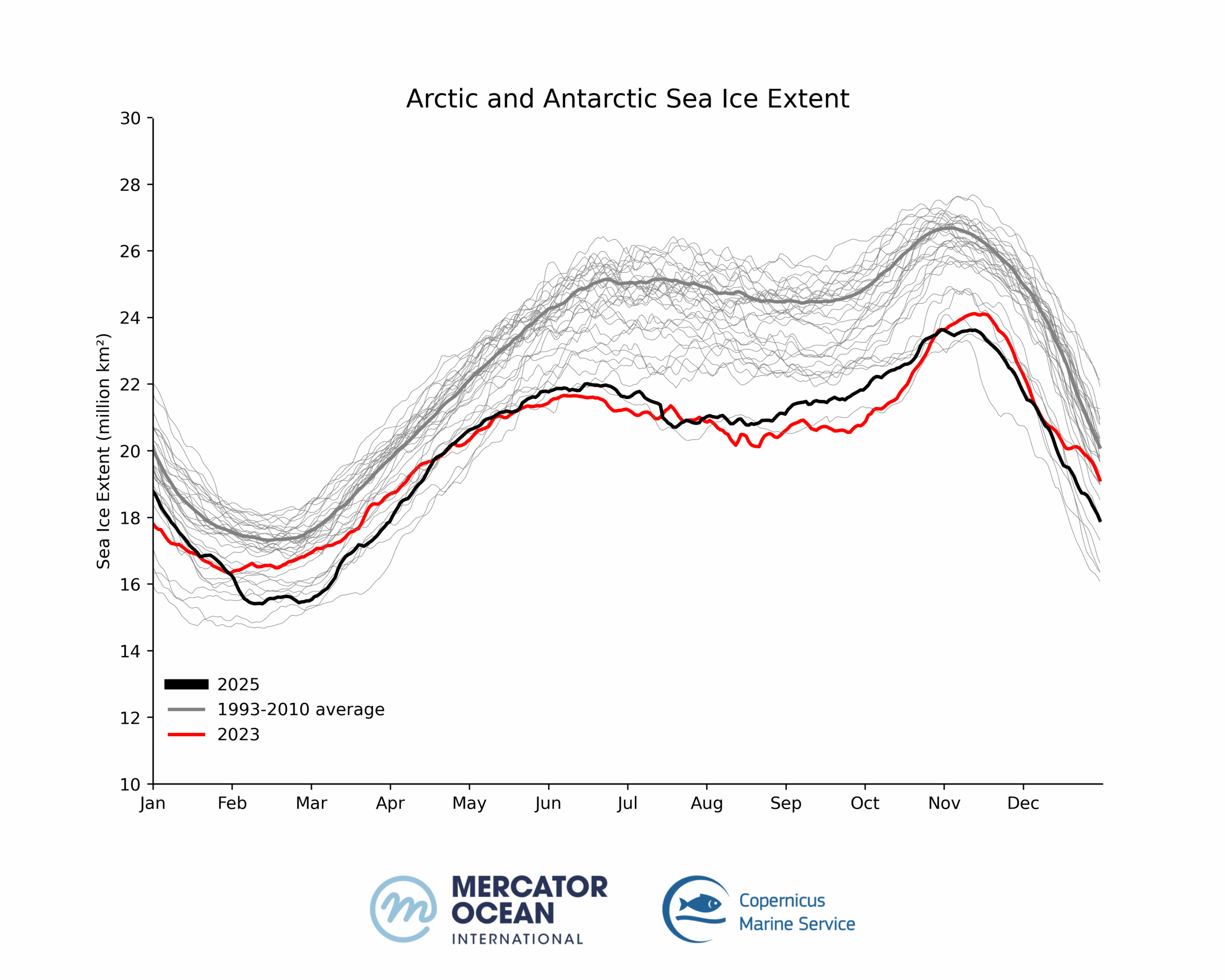 Global sea ice cover in 2025 continued well below the long-term average for most of the year. 11 out of 12 months of the year within the five lowest extents.