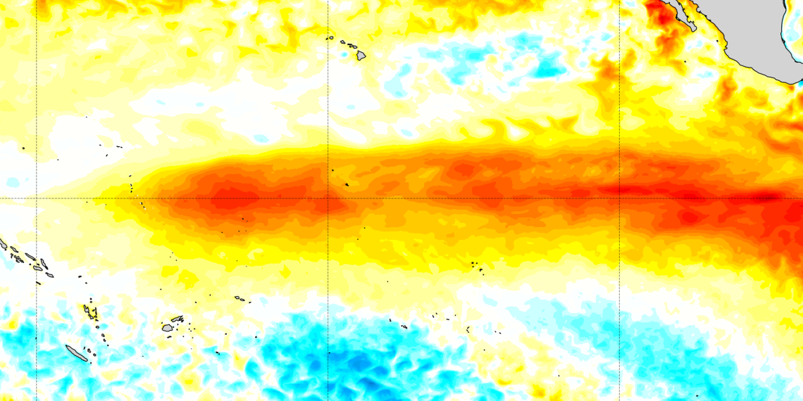The future evolution of this year’s El Niño into a super event remains to be determined, as it is  possible that ocean warming will increase in the coming months.