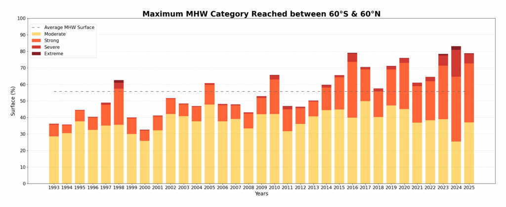 Figure 5 : Évolution de l’étendue de la catégorie de PMH la plus élevée. Pour chaque année, la longueur de la barre représente le pourcentage de la région touchée par les PMH, tandis que les couleurs indiquent la proportion des catégories les plus élevées atteintes dans cette région. La ligne horizontale en pointillés représente la surface moyenne de la région touchée par les NMM au cours du semestre entre 1993 et 2025. La région représentée est l’océan mondial (60°S à 60°N).