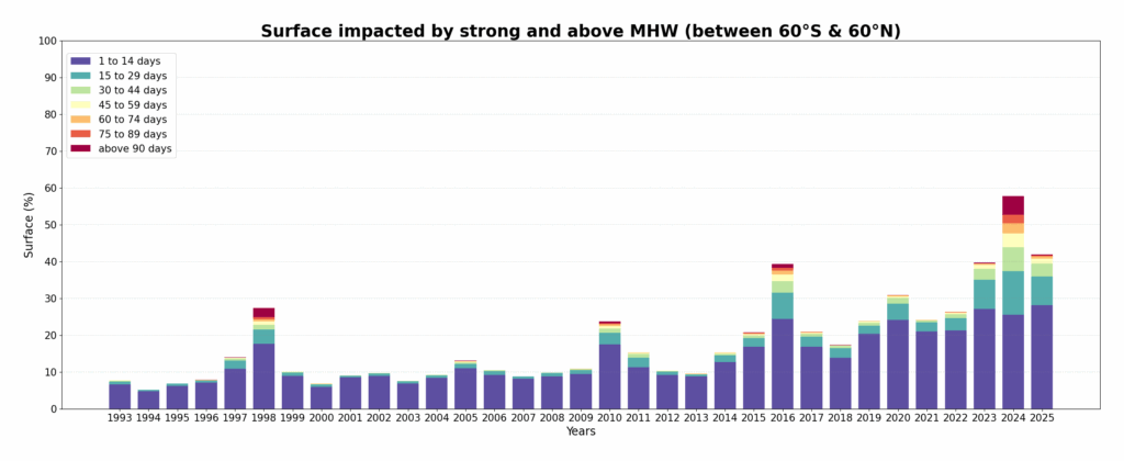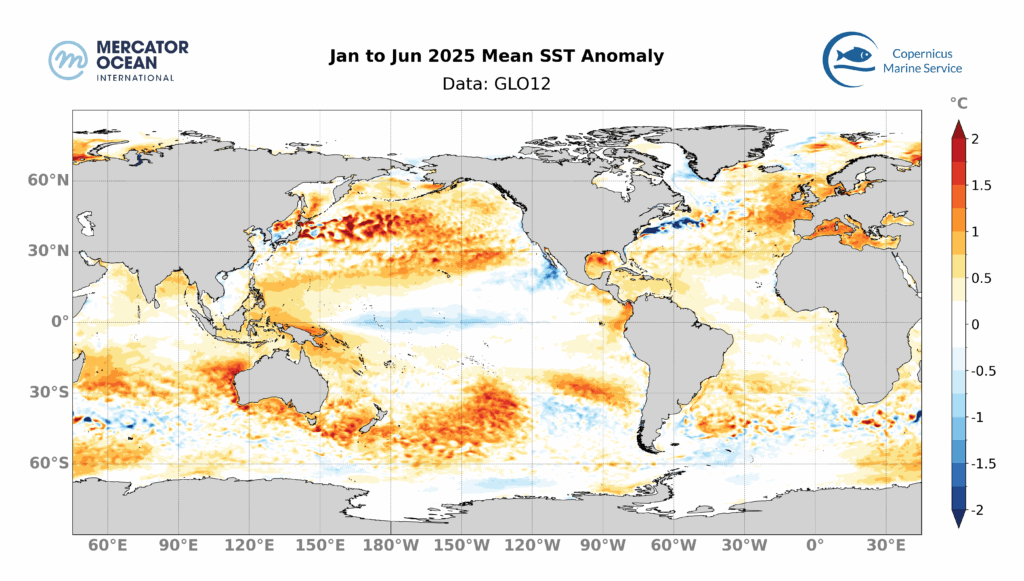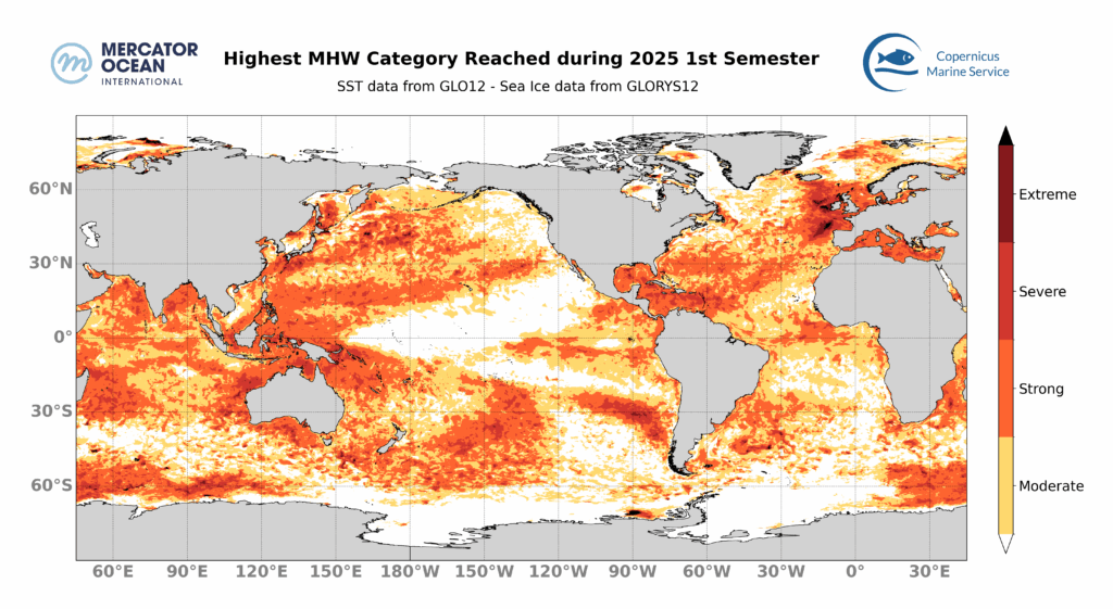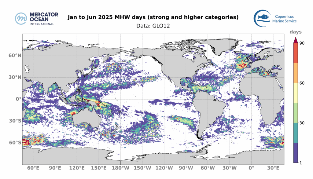 • 79% de l’océan mondial a été touché par les HMW au cours du premier semestre 2025 – la troisième plus grande étendue touchée par les HMW après 2016 (79%) et 2024 (83%).