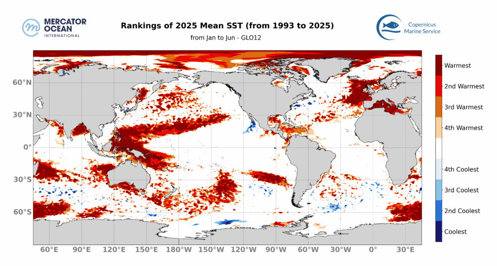 Figure 2 : Classement des TSM moyennes semestrielles pour 2025 depuis 1993 en utilisant les données quotidiennes de l’analyse GLO12 de Mercator Ocean International de 2021 à 2025 et de la réanalyse GLORYS12 de 1993 à 2020.Les zones vides signifient que la TSM moyenne de 2025 ne se classe pas parmi les 4 TSM moyennes les plus chaudes ou les 4 TSM moyennes les plus froides depuis 1993.