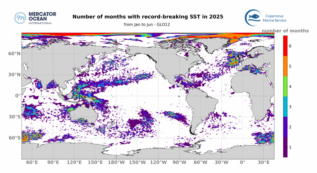 Figure 3 : Nombre de mois ayant enregistré une TSM moyenne record entre janvier et juin 2025. Les zones vides signifient qu’aucun mois n’a été classé parmi les plus chauds depuis 1993.