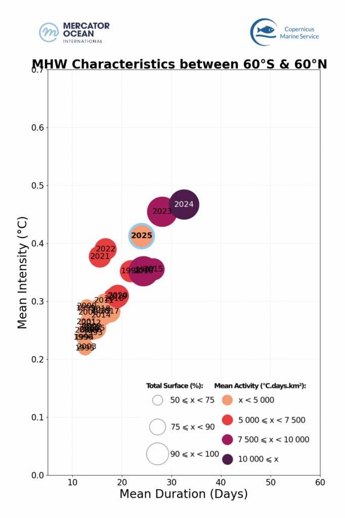 Figure 8 : Caractéristiques des vagues de chaleur marine en milieu d’année de 1993 à 2025. Durée, intensité, étendue et activité moyennes pour chaque semestre entre 1993 et 2025 pour l’océan mondial. l’année 2025 est mise en évidence par un bord bleu.