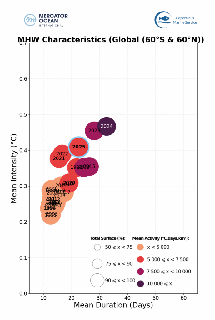 Mercator Ocean International (MOi) publie chaque année sur le site un bulletin de température de surface faisant état de la température moyenne de surface et des conditions de la Vague de chaleur marine (VCM) pour l’année 2025. Ce bulletin se concentre sur l’océan mondial (entre 60°S et 60°N) et 2 régions : la mer Méditerranée et l’Atlantique Nord (entre 0°N et 60°N).Principaux enseignements pour 2025 :