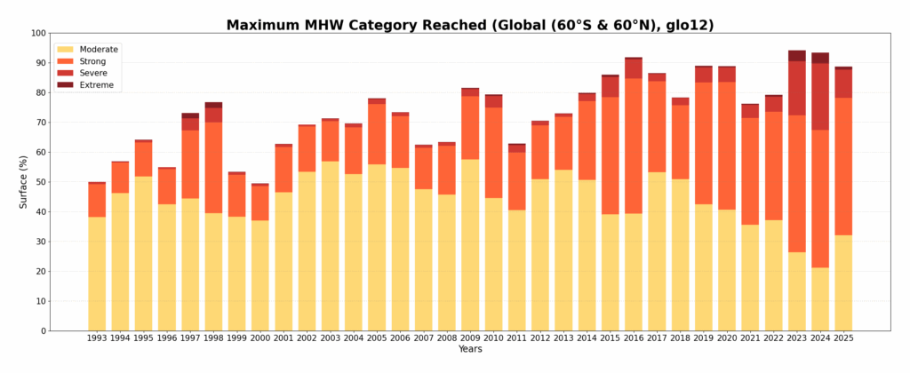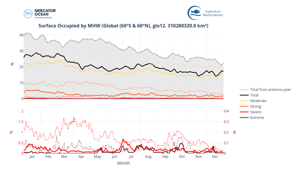 Les vagues de chaleur marine sont des événements anormalement chauds pour lesquels des températures extrêmes sont observées pendant au moins 5 jours consécutifs. Leur occurrence et leur gravité sont surveillées car les vagues de chaleur marine – lorsqu’elles sont prolongées ou intenses – peuvent avoir un impact négatif sur l’environnement et les écosystèmes. Les nuisances sonores peuvent être classées selon leur intensité en quatre catégories (modérée, forte, sévère ou extrême). Nous surveillons quotidiennement la surface occupée par les eaux marines et montrons pour l’année entière la proportion de l’ Ocean global (entre 60°S et 60°N) exposée aux eaux marines (Figure 5).