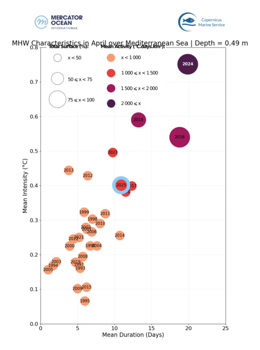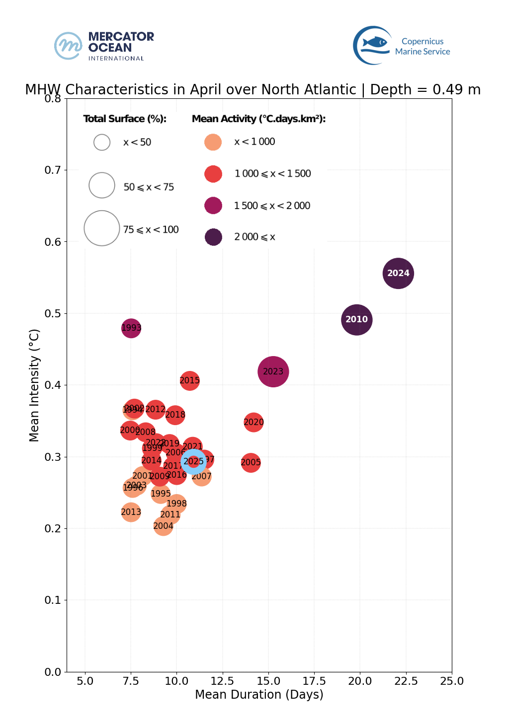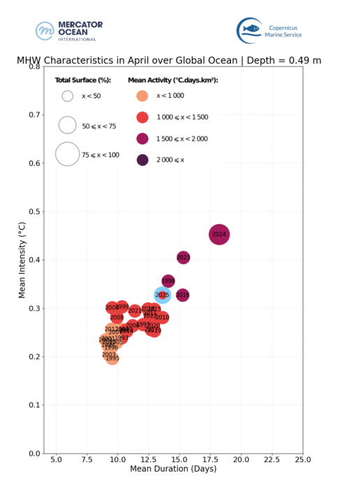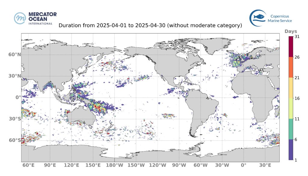 • Dans l’Atlantique Nord, le mois d’avril 2025 a été modéré en termes de MHW par rapport aux années précédentes.