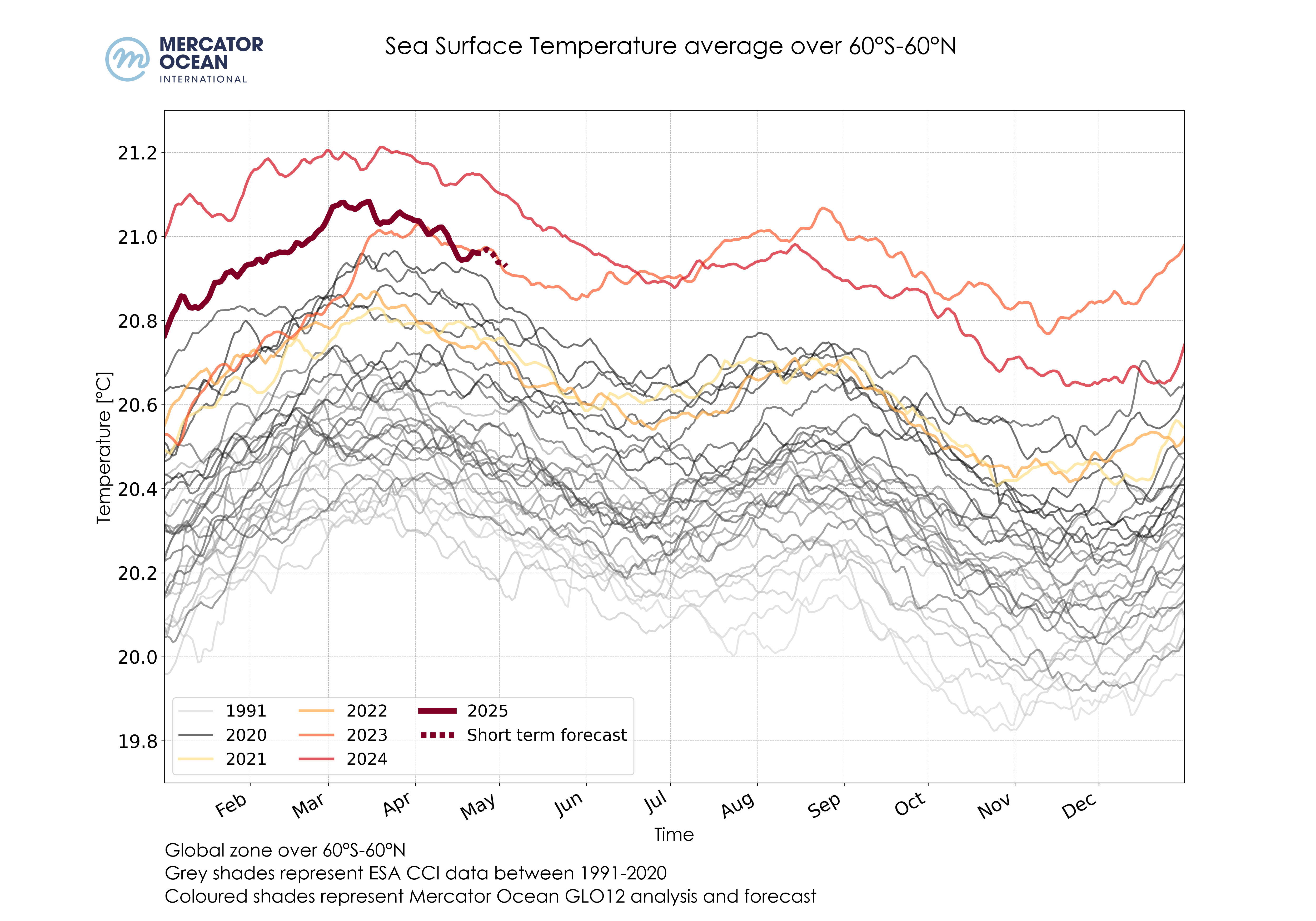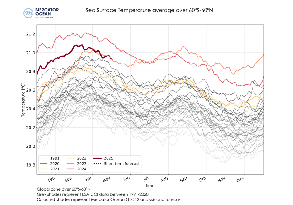 • Avril 2025, au niveau mondial (entre 60°S et 60°N), a été ledeuxième mois d’avril le plus chaud jamais enregistré (après 2024), avec une température moyenne de surface de la mer (SST) de 20,95 ± 0,05 °C (contre 21,11 ± 0,07 °C pour 2024).