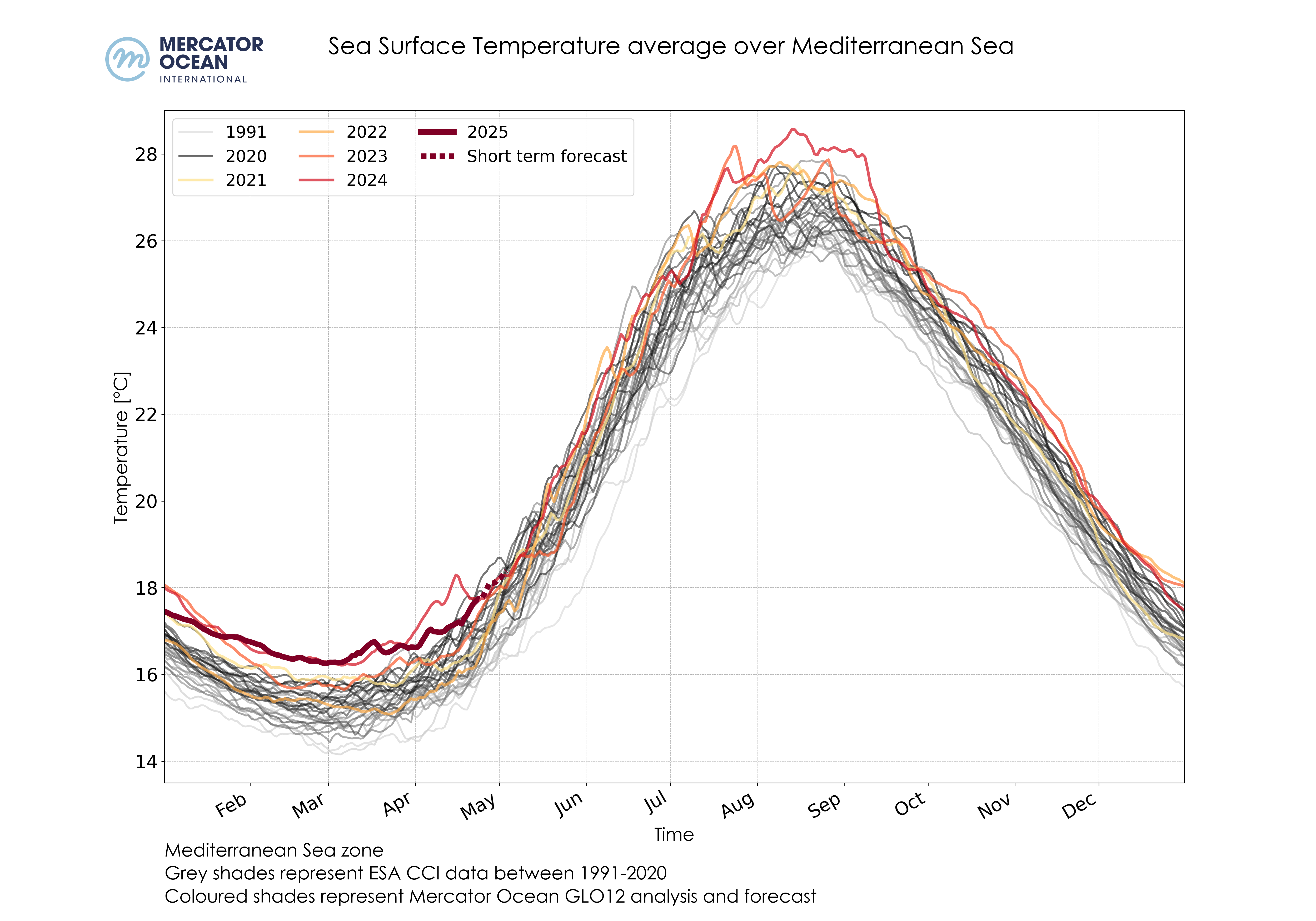 Figure 1 :  Températures quotidiennes de surface de la mer (TSM) moyennées pour l’océan mondial (en haut), la mer Méditerranée (à gauche) et l’océan Atlantique Nord (à droite) entre 1991-2020 à l’aide de l’initiative sur le changement climatique de l’ESA (nuances grises), et entre 2021-2025 (nuances colorées) à l’aide de l’analyse et des prévisions GLO12 de Mercator Ocean International.