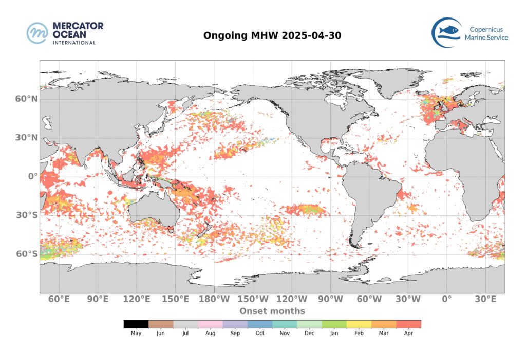 • Avril 2025 a été le cinquième mois d’avril le plus extrême en termes de durée, d’intensité et d’étendue des vagues de chaleur marine dans l’océan mondial.