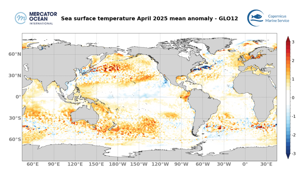 Figure 2 : Anomalie de température moyenne de surface de la mer d’avril 2025 par rapport à une climatologie de 30 ans (1993-2022), calculée à partir des données quotidiennes du système d’analyse et de prévision GLO12 de Mercator Ocean International pour 2025 et de la réanalyse GLORYS12 pour la moyenne climatologique.