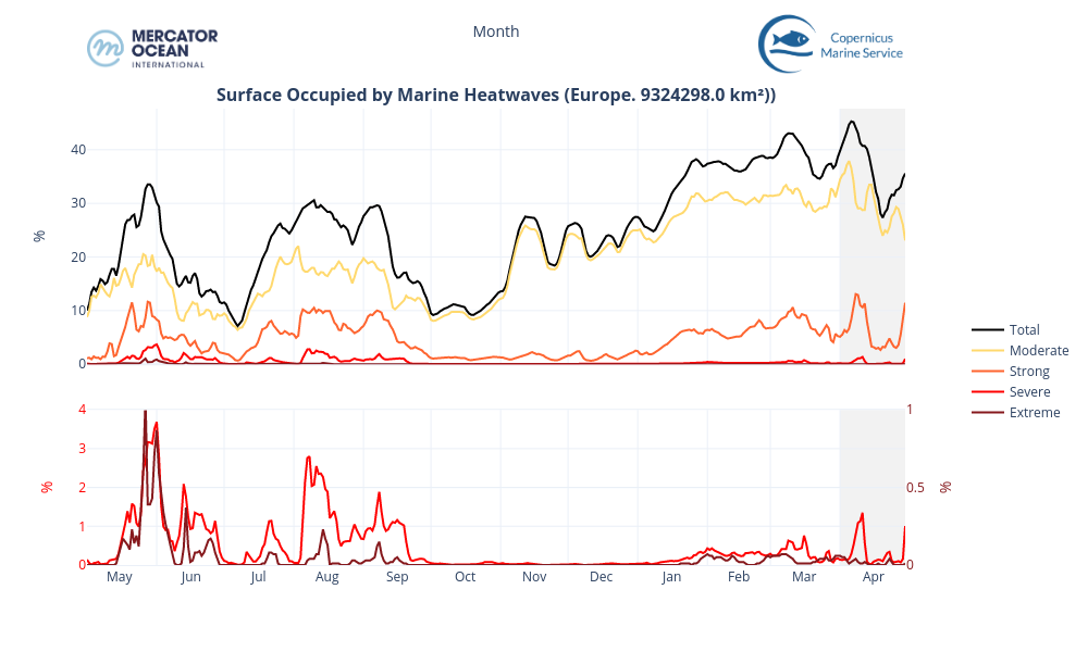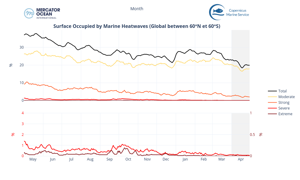• En avril, la surface totale de la HMT (ligne noire) a diminué de 23% à 20% de l’océan global (entre 60°S et 60°N). Ces HMT se composent principalement d’événements modérés et forts (18% et 2%, respectivement, à la fin du mois). À titre de comparaison, en avril 2024, l’étendue totale de la SSM représentait ~36 % de l’océan mondial (entre 60°S et 60°N), avec ~10 % de la catégorie forte (non illustré).