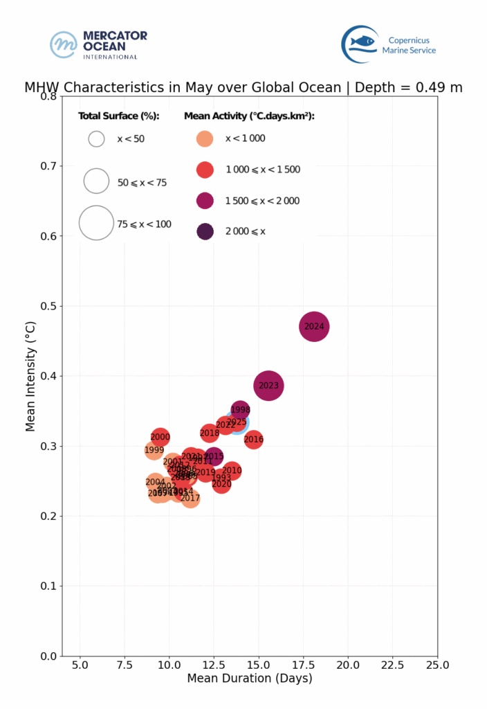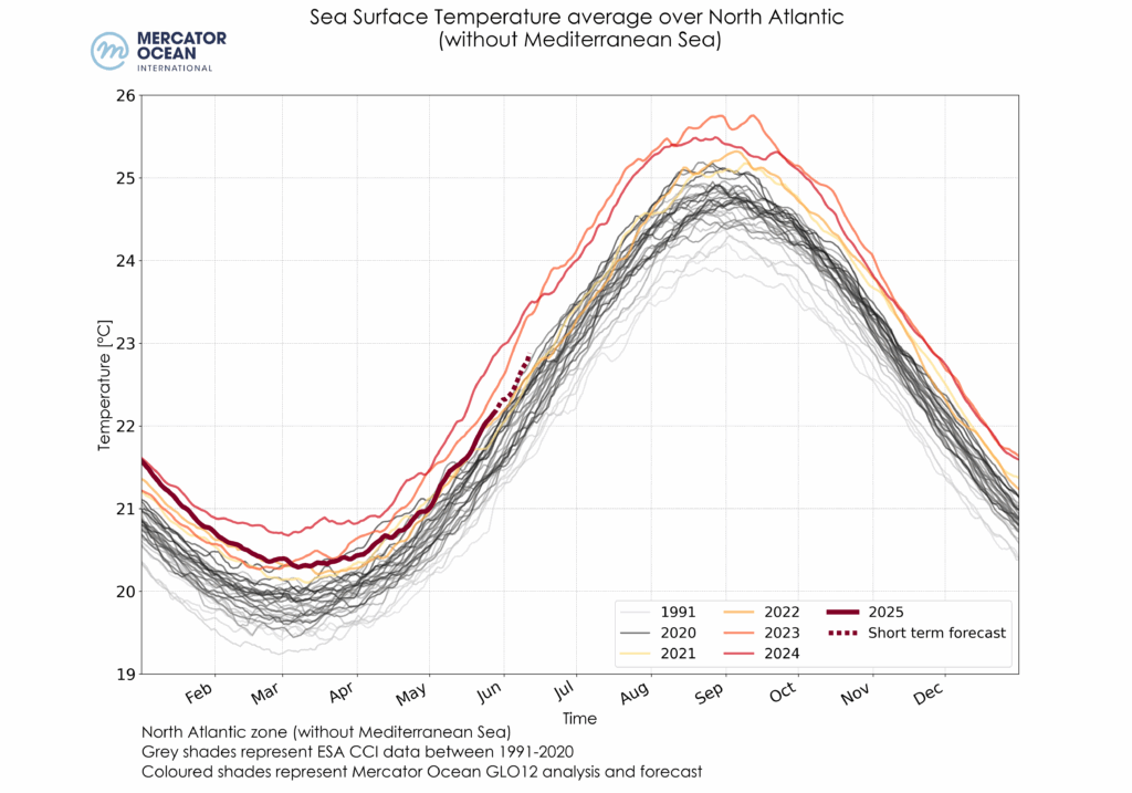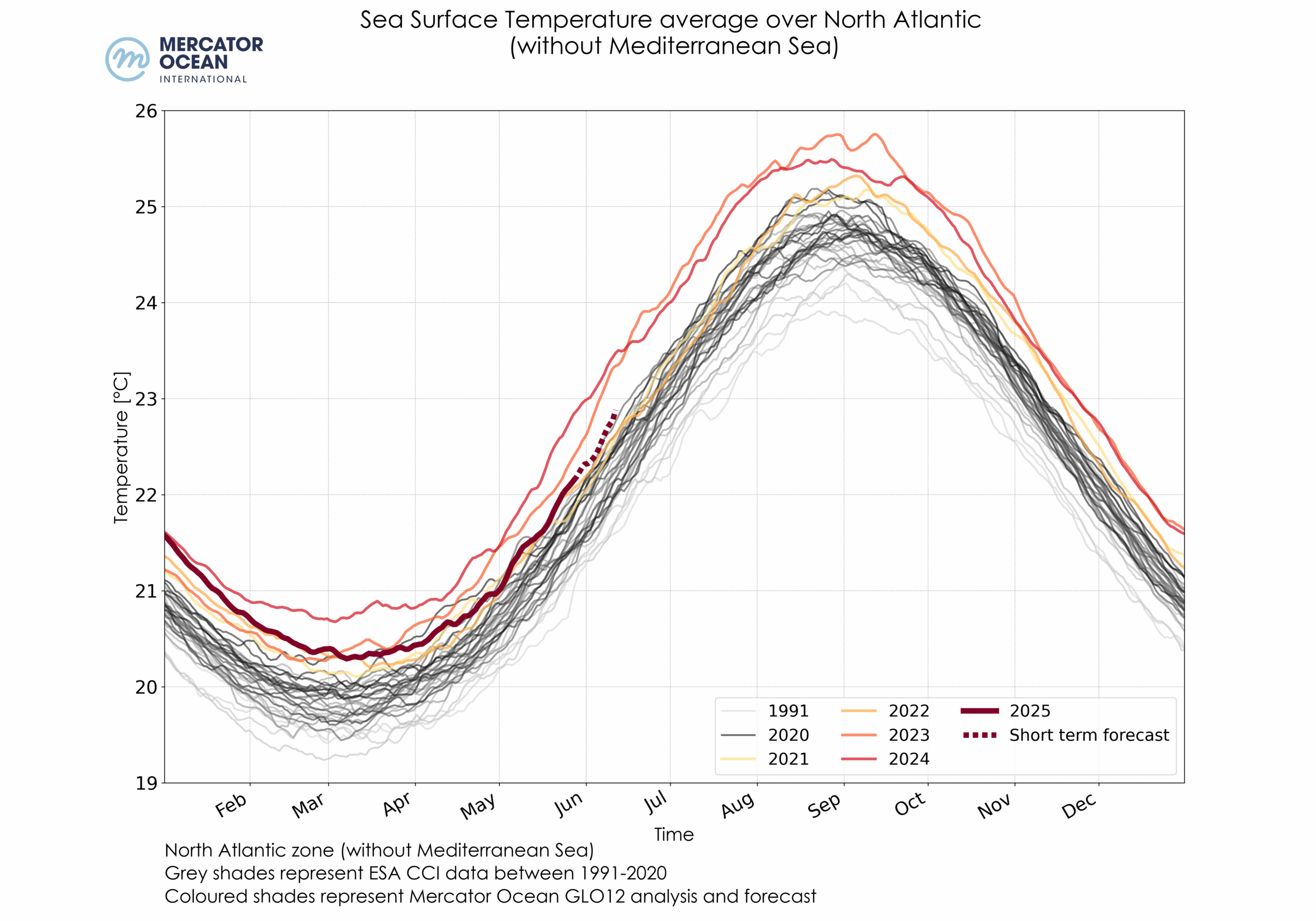 - letroisième mois de mai le plus chaud jamais enregistré (après 2023 et 2024) dans l’Océan mondial et dans l’Océan Atlantique Nord.