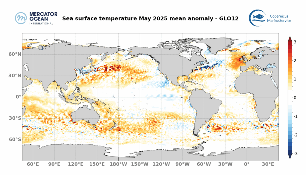 - Mai 2025, au niveau mondial (entre 60°S et 60°N), a été le troisième mois de mai le plus chaud jamais enregistré (après 2023 et 2024), avec une température moyenne de surface de la mer (SST) de 20,84 ± 0,07 °C.