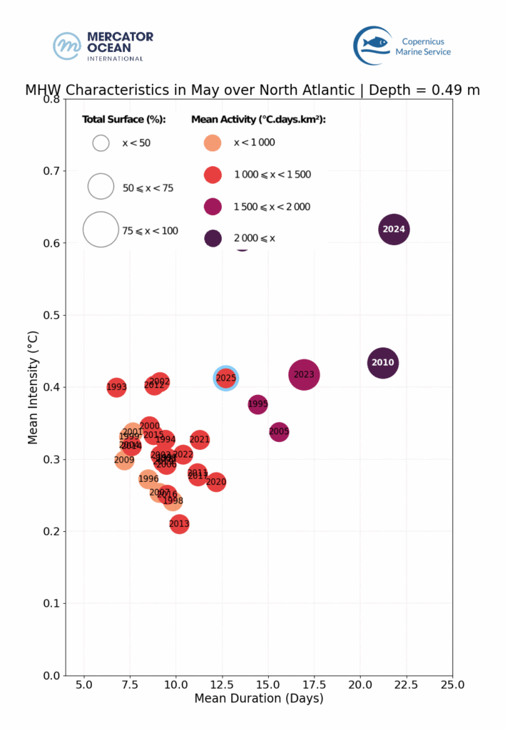 Dans l’Atlantique Nord, le mois de mai 2025 fait partie des 10 mois de mai les plus extrêmes en termes de PMH.