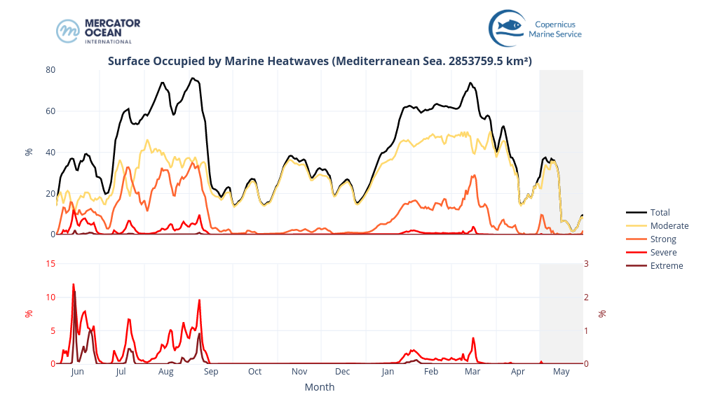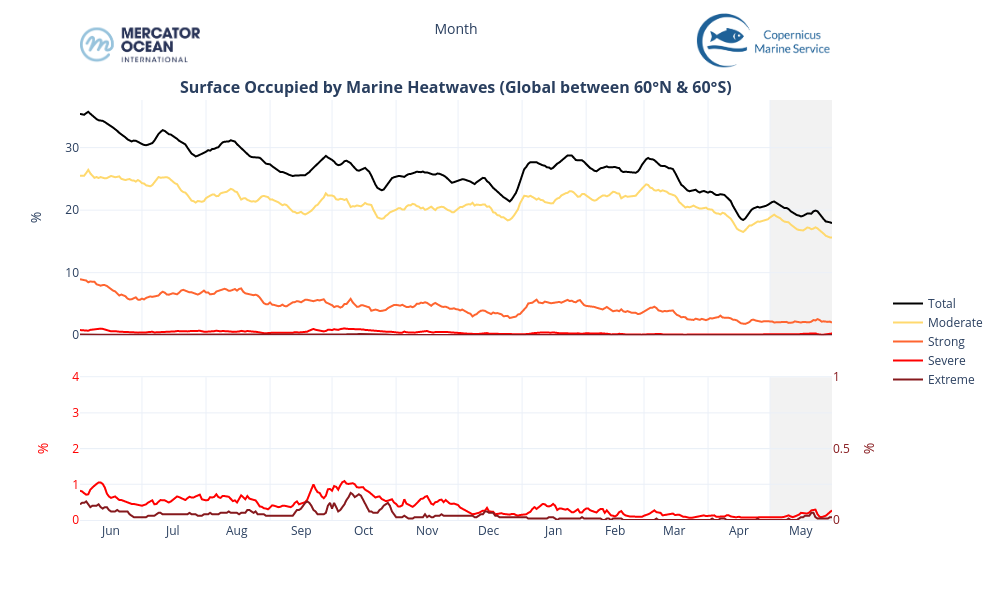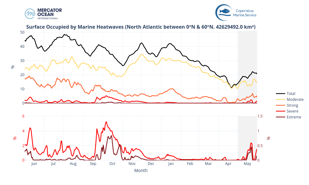 - La surface totale MHW montre une diminution importante de ~35% dans la première moitié du mois de mai à ~9% à la fin du mois (après une chute à 2%).