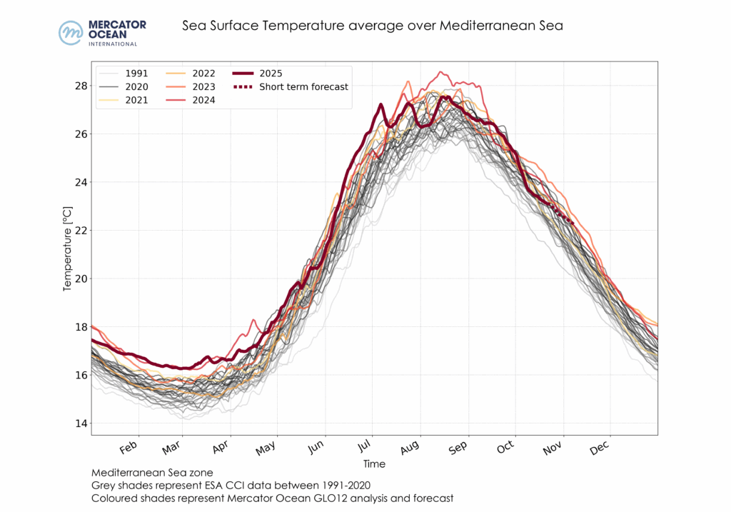 Mercator Ocean International publie chaque mois un bulletin de température de surface de la mer faisant état de la température moyenne et des conditions de canicule marine pour le mois écoulé. Il comprend