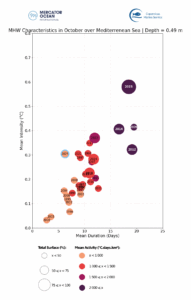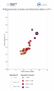 Caractéristiques des vagues de chaleur marine (durée, intensité, étendue et activité) pour les mois d’octobre entre 1993 et 2025. Le mois d’octobre 2025 est souligné par un bord bleu. Chaque bulle correspond au mois d’octobre d’une année donnée. Sa position sur l’axe horizontal – durée, sur l’axe vertical – intensité, la taille de chaque bulle indique la surface moyenne occupée, et la couleur représente l’activité de la SSM. Les caractéristiques moyennes des MHW sont calculées pour chaque mois pour l’océan global, l’Atlantique Nord et la mer Méditerranée afin d’obtenir un profil MHW pour chaque mois qui peut être comparé à ces mêmes mois des années précédentes (depuis 1993) dans un diagramme à bulles (figure ci-dessus).